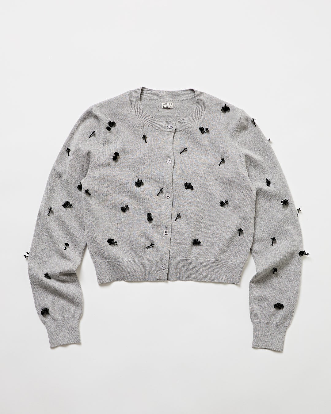 バーニーズ ニューヨークでは、ビジューのついた華やかなカーディガンをグレー×ブラックのシックなカラーで別注。ビジューの甘さとシックな色遣いがバランスよく、コーディネートの主役となるアイテムです。背中に施されたブランドロゴも、さりげないポイント。