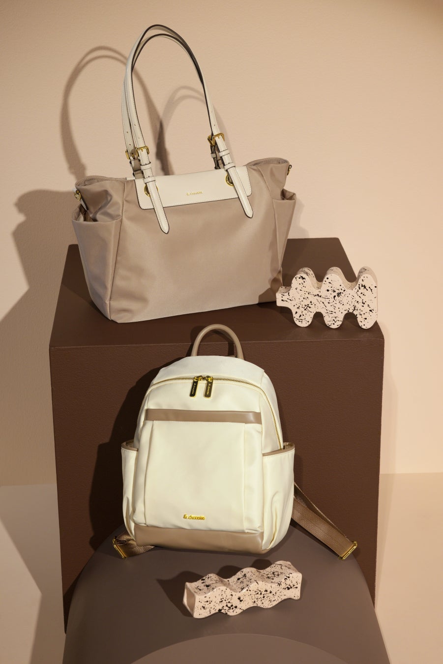持ち手やバッグのボディ部分に組み合わせられたバイカラー配色にも注目。