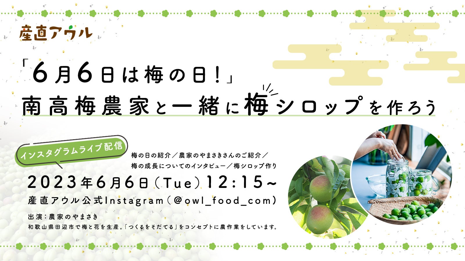 6月6日(火)の昼12時15分より、梅をテーマとしたインスタライブを配信します。今回の配信では、梅の生産方法や梅を使ったレシピを紹介し梅の魅力や楽しみ方の認知を広げることを目的としています。ライブでは産直アウルスタッフが和歌山で南高梅を栽培する農家のやまさきさんを訪問します。農園では、梅の成長の紹介ややまさきさん指導のもと梅シロップ作りを体験する様子を配信し、梅シロップを使ったレシピとして和歌山県考案の梅ラッシーも紹介します。また、同日「この時期だけの梅仕事を楽しもう」をテーマに産直アウルサイト内に梅仕事の特集ページを公開します。