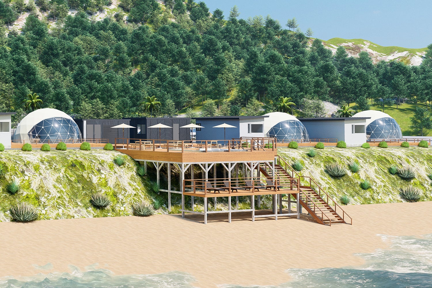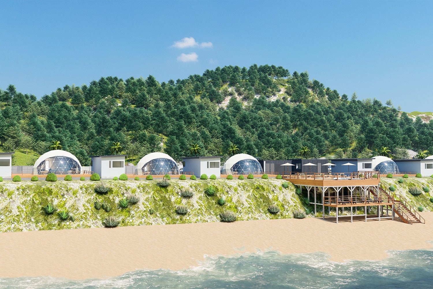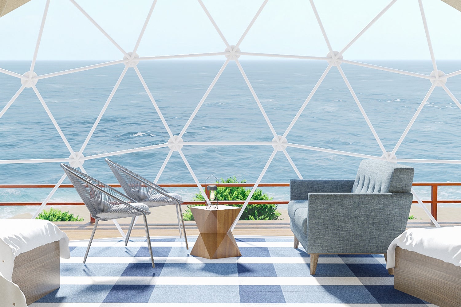 東シナ海の青い海を一望できる絶景スポットに立ち並ぶ全5棟のドームテント。