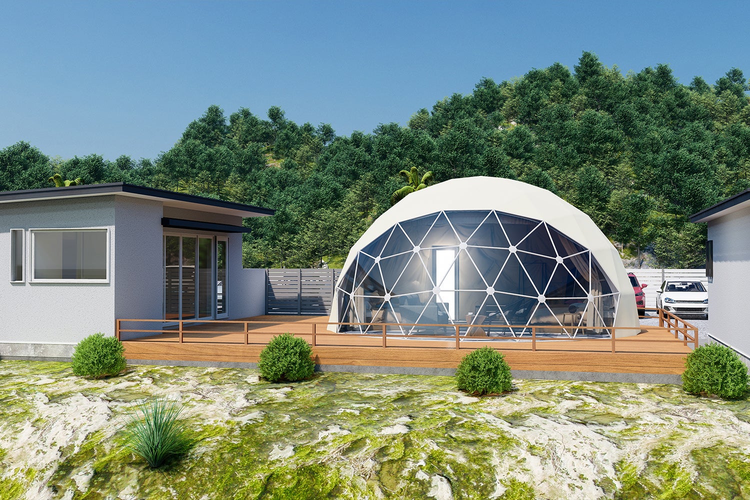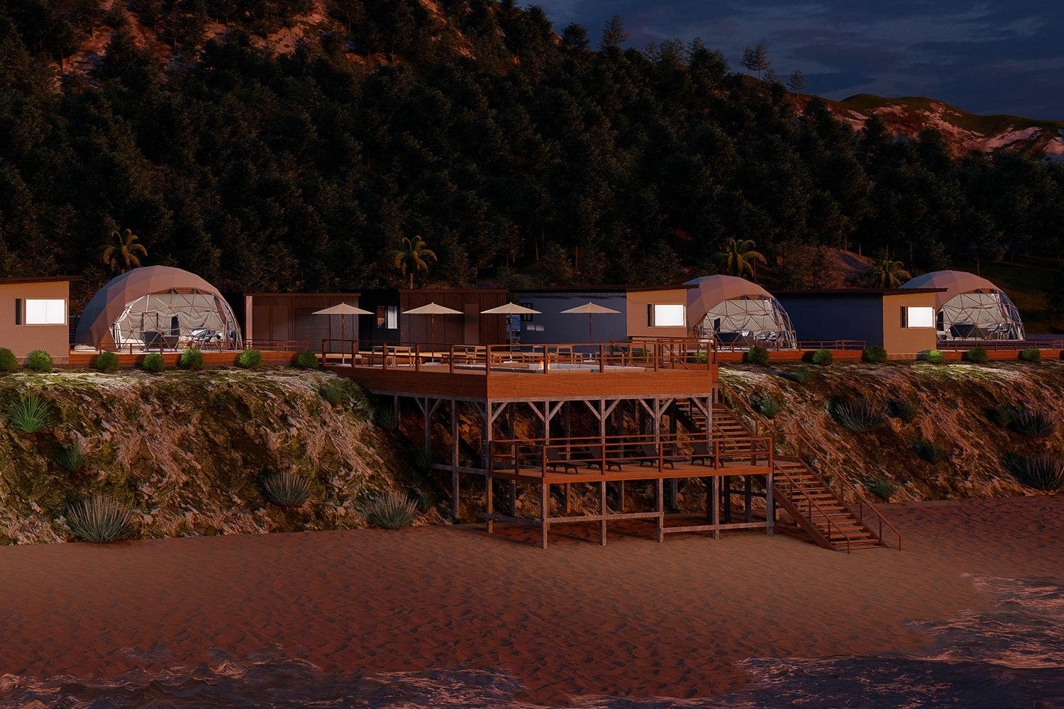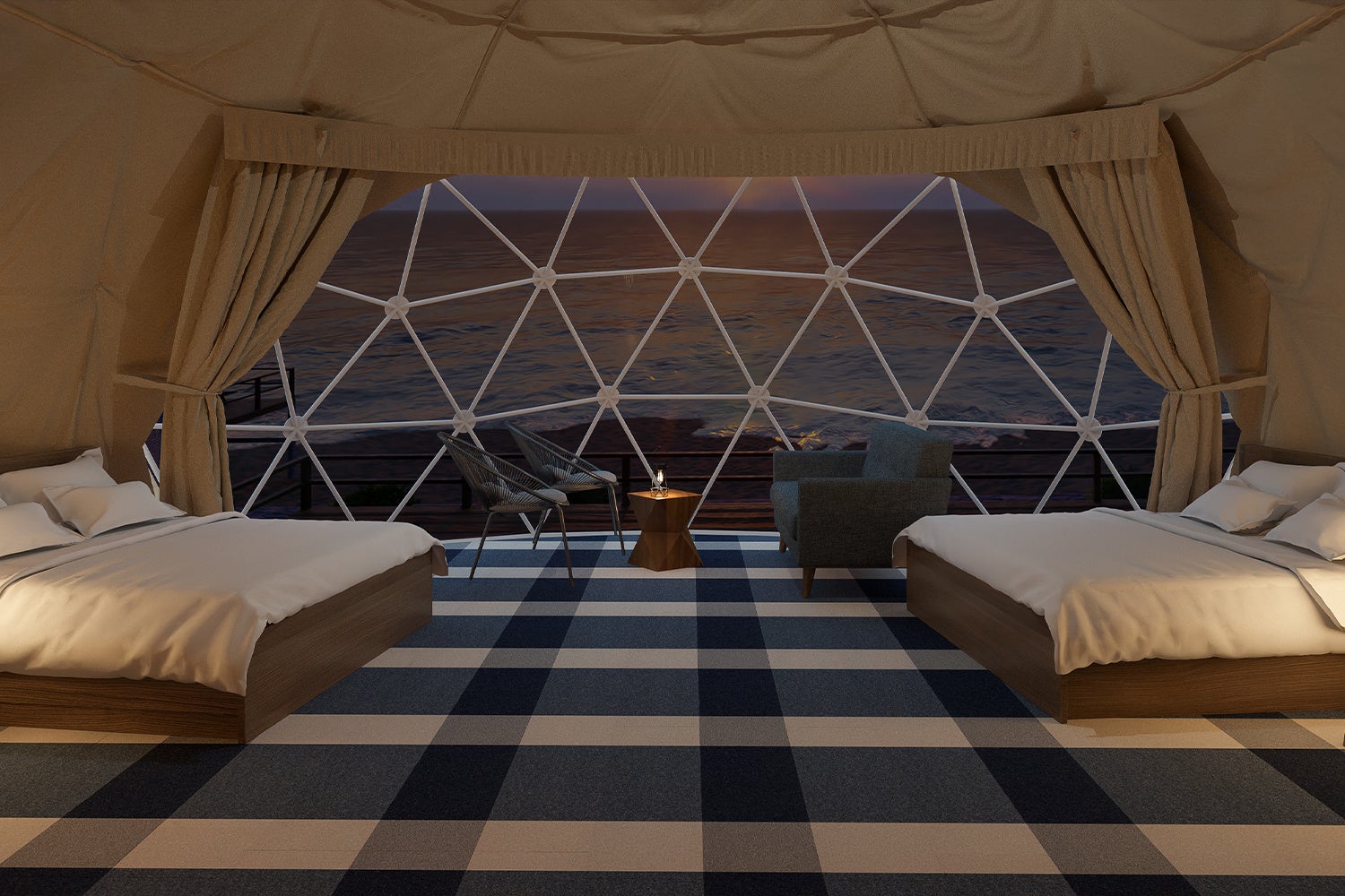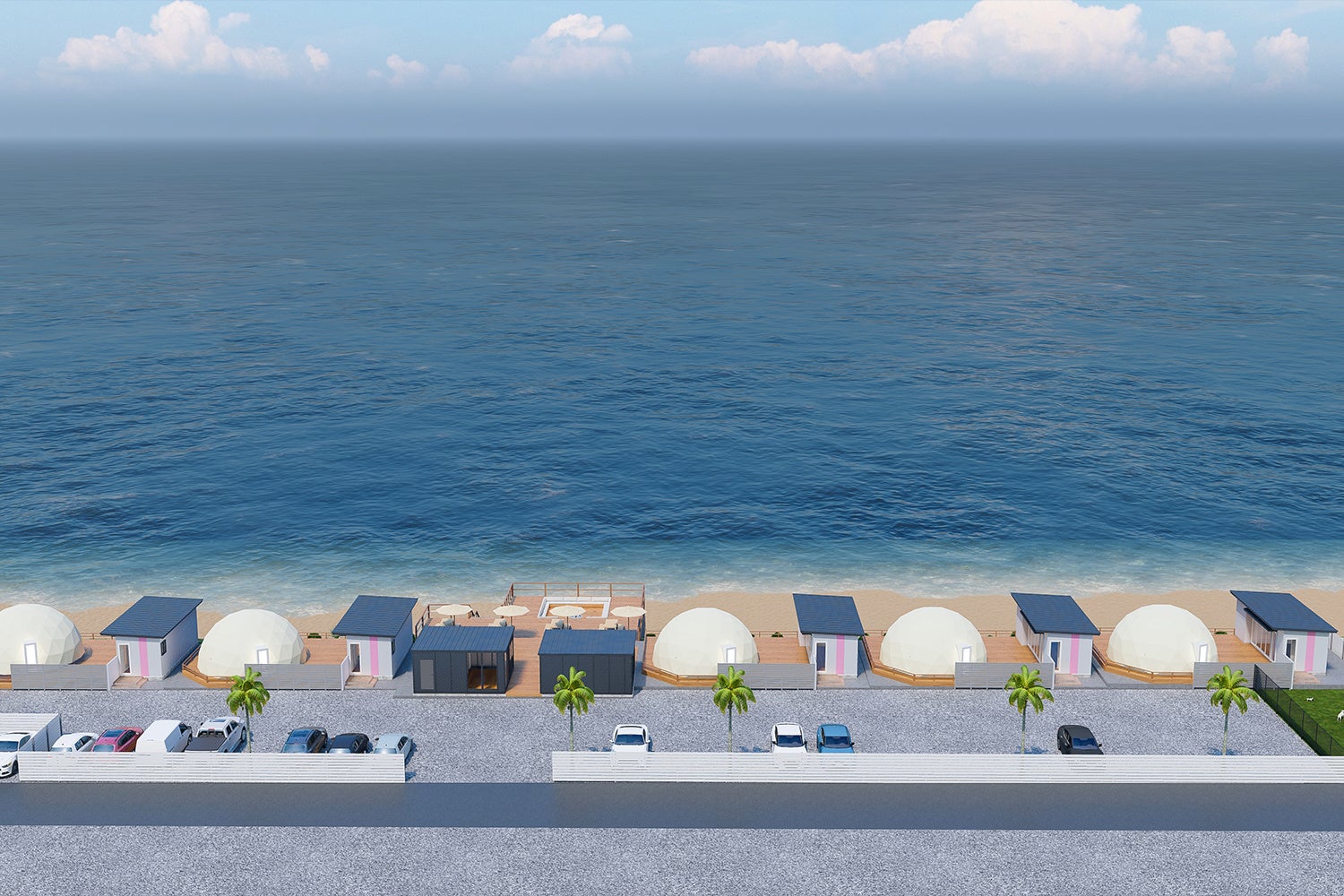 東シナ海の青い海を一望できる絶景スポットに立ち並ぶ全5棟のドームテント。
