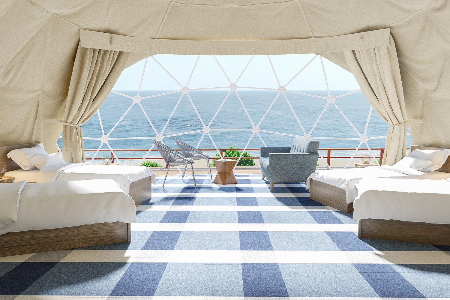 一面に広がる白い砂浜と、東シナ海の青い海を堪能できるグランピングリゾート「ナミオトテラスリゾート鹿児島~NAMIOTO TERRACE RESORT KAGOSHIMA」がオープン。