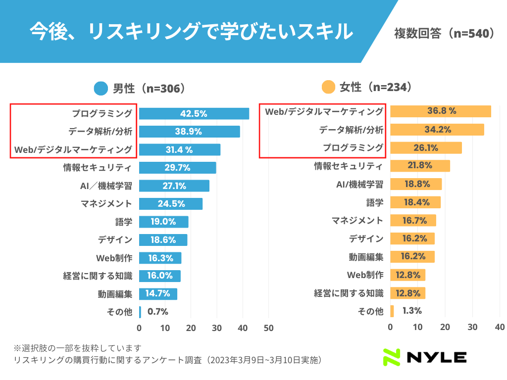 また、現在全国で働いている男女540名に「今後学びたいスキル」を聞いたところ、男性1位「プログラミング」、女性の1位は「Web/デジタルマーケティング」でした。