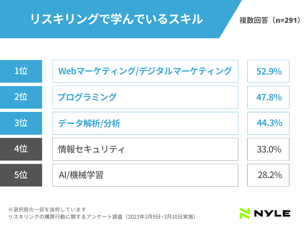 当社の独自調査によると、リスキリングを実施している291名の会社員に「現在学んでいるスキル」を聞いたところ、1位は「Web/デジタルマーケティング」でした。