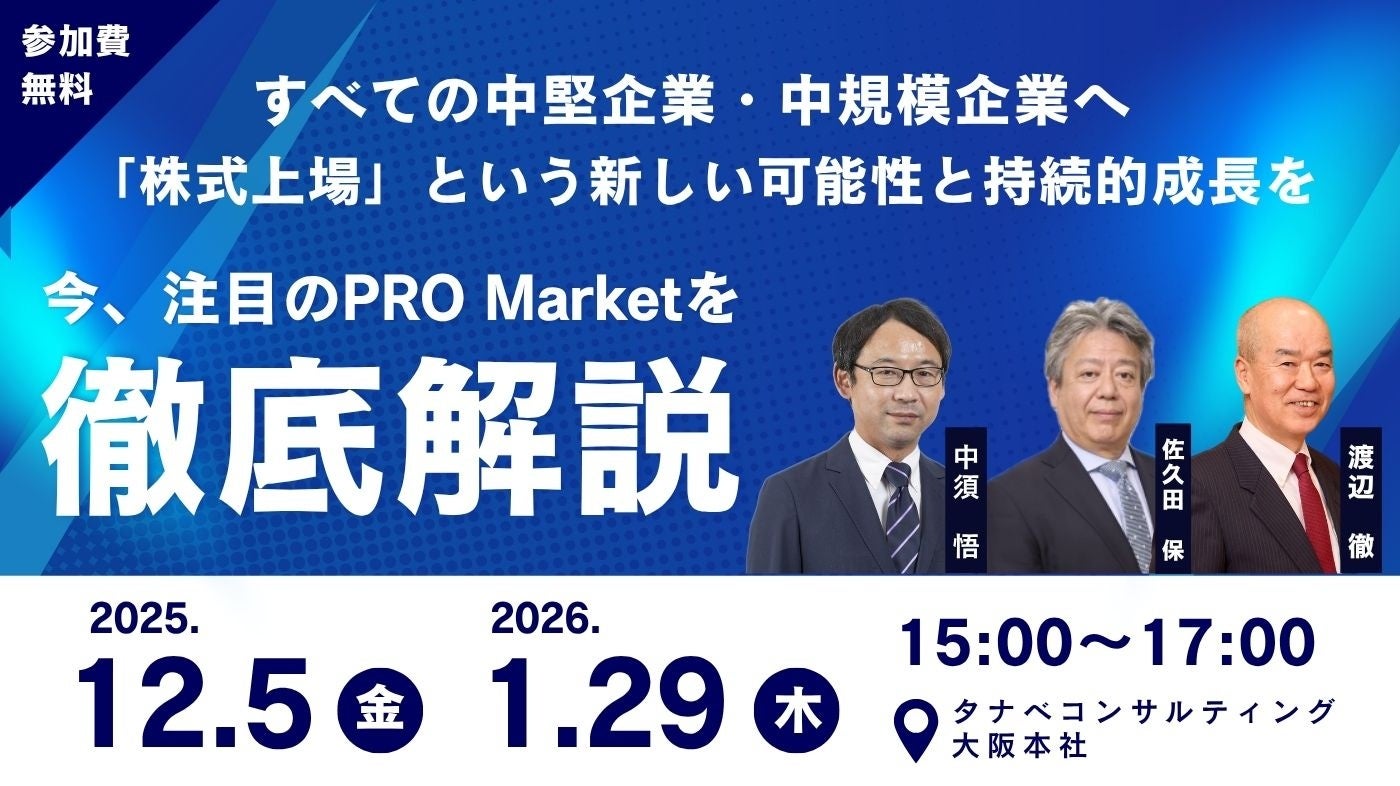 日本の経営コンサルティングのパイオニアである株式会社タナベコンサルティング(本社:東京都千代田区・大阪市淀川区、代表取締役社長:若松 孝彦)は、2025年12月5日(金)15:00~17:00と2026年1月29日(木)15:00~17:00に、「すべての中堅企業・中規模企業へ『株式上場』という新しい可能性と持続的成長を。【今、注目のPRO Marketを徹底解説】」をリアルで開催いたします。URL: https://eu1.hubs.ly/H0pKKkk0