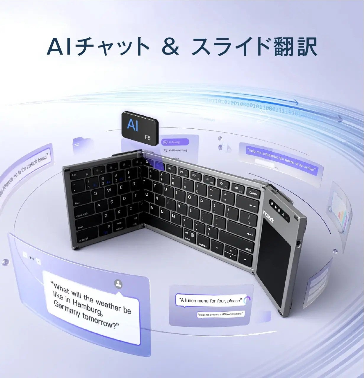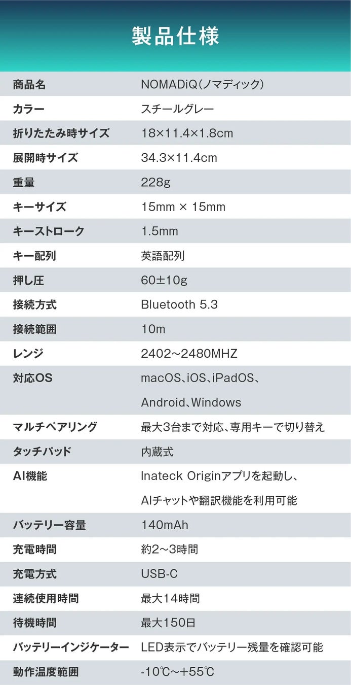 AI呼び出し機能を搭載した新世代の折りたたみ式ワイヤレスキーボード「NOMADiQ(ノマディック)」が登場!AIによるスライド翻訳やチャット機能、マウスいらずのタッチパッドなど、今欲しい機能をこの1台に。