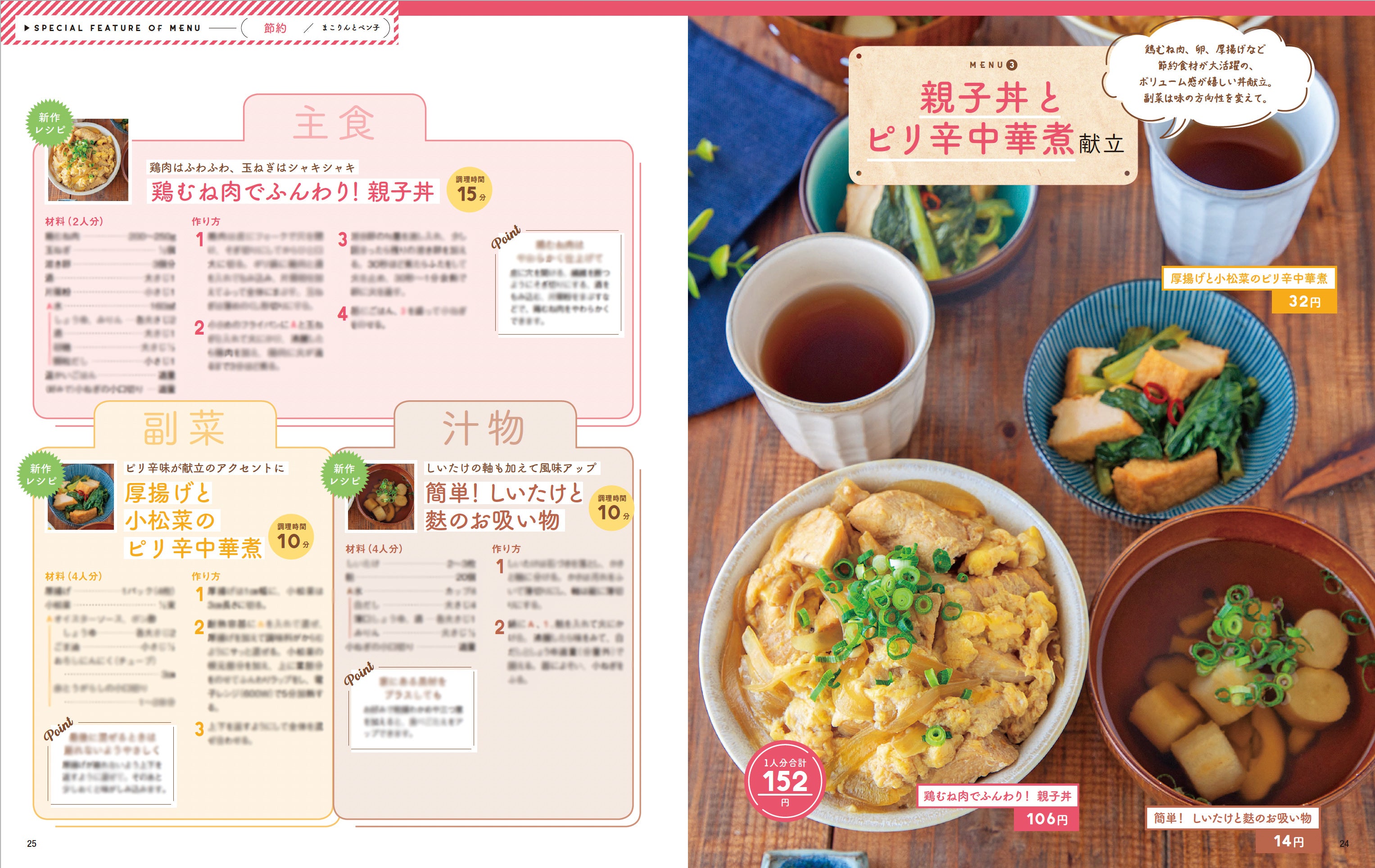節約献立では1人分あたりの食費を、やせる献立では脂質量や糖質量を掲載。難しい計算いらずで、ただマネするだけで節約やダイエットがかないます。
