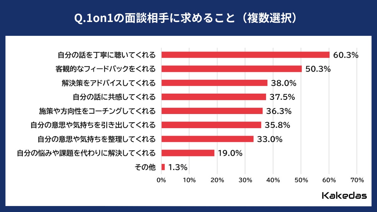 「1on1の面談相手に求めることは何ですか?」と質問したところ、「自分の話を丁寧に聴いてくれる」が60.3%、「客観的なフィードバックをくれる」が50.3%、「解決策をアドバイスしてくれる」が38.0%、「自分の話に共感してくれる」が37.5%、「施策や方向性をコーチングしてくれる」が36.3%、「自分の意思や気持ちを引き出してくれる」が35.8%、「自分の意思や気持ちを整理してくれる」が33.0%、「自分の悩みや課題を代わりに解決してくれる」が19.0%、「その他」が1.3%となりました。