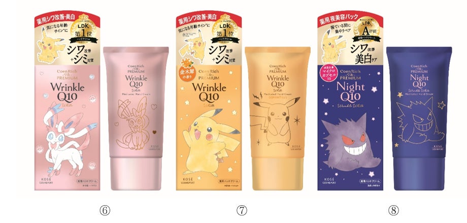 ⑥「薬用リンクルホワイト ハンドクリーム」にはニンフィアを採用。シワ改善効果とシミ対策効果※2のある有効成分として「ナイアシンアミド」を配合、乾燥・ハリのなさなどの気になる“年齢サイン”をケアする薬用ハンドクリームです。⑦「薬用リンクルホワイト ハンドクリーム 金木犀の香り」にはピカチュウを採用。シワ改善とシミ対策効果※2のある有効成分として「ナイアシンアミド」を配合したハンドクリームです。天然香料を使用し、甘さがあり穏やかで落ち着く香調で仕上げた“ふんわり優しい 金木犀の香り”が手肌を心地よく包み込みます。⑧「薬用リンクルナイト ハンドクリーム」にはゲンガーを採用。1日中酷使し、寝ている間にうるおいを失ったダメージ手肌を集中リペア※3し、シワ改善・美白※2ケアする薬用夜美容パックです。マイクロカプセル化した浸透※1促進成分を配合。睡眠中の手肌にうるおい・ハリをあたえ、翌朝ふっくら明るい手肌へ導きます。寝る前に心地よい リラクシングフローラルの香りです。