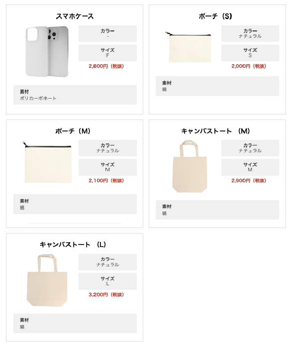 取り扱いアイテム: Tシャツ、スマホケース、文房具、のぼり旗他(毎月2アイテムずつ追加!)