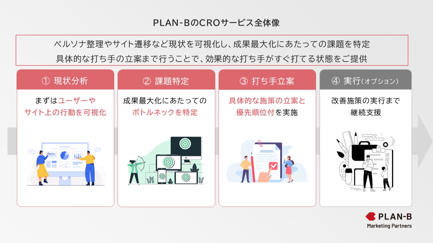 5,000社以上のSEO支援実績をもつ株式会社PLAN-Bマーケティングパートナーズ (東京都品川区、代表取締役:鳥居本真徳、以下「当社」)は、SEOと連携しWebサイトのコンバージョン率(CVR)を改善する「CROコンサルティングサービス」を新たに提供開始いたしました。