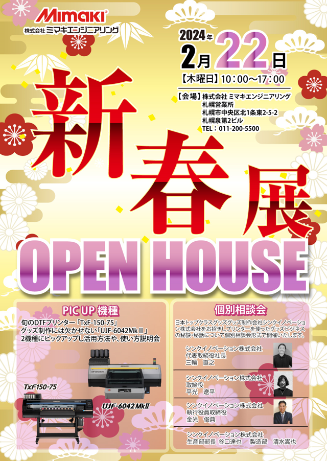 この度、弊社シンクイノベーション株式会社は、株式会社ミマキエンジニアリング札幌営業所にて開催される新春展でプリンタを使ったグッズビジネスの個別相談会を開催させて頂きます。
