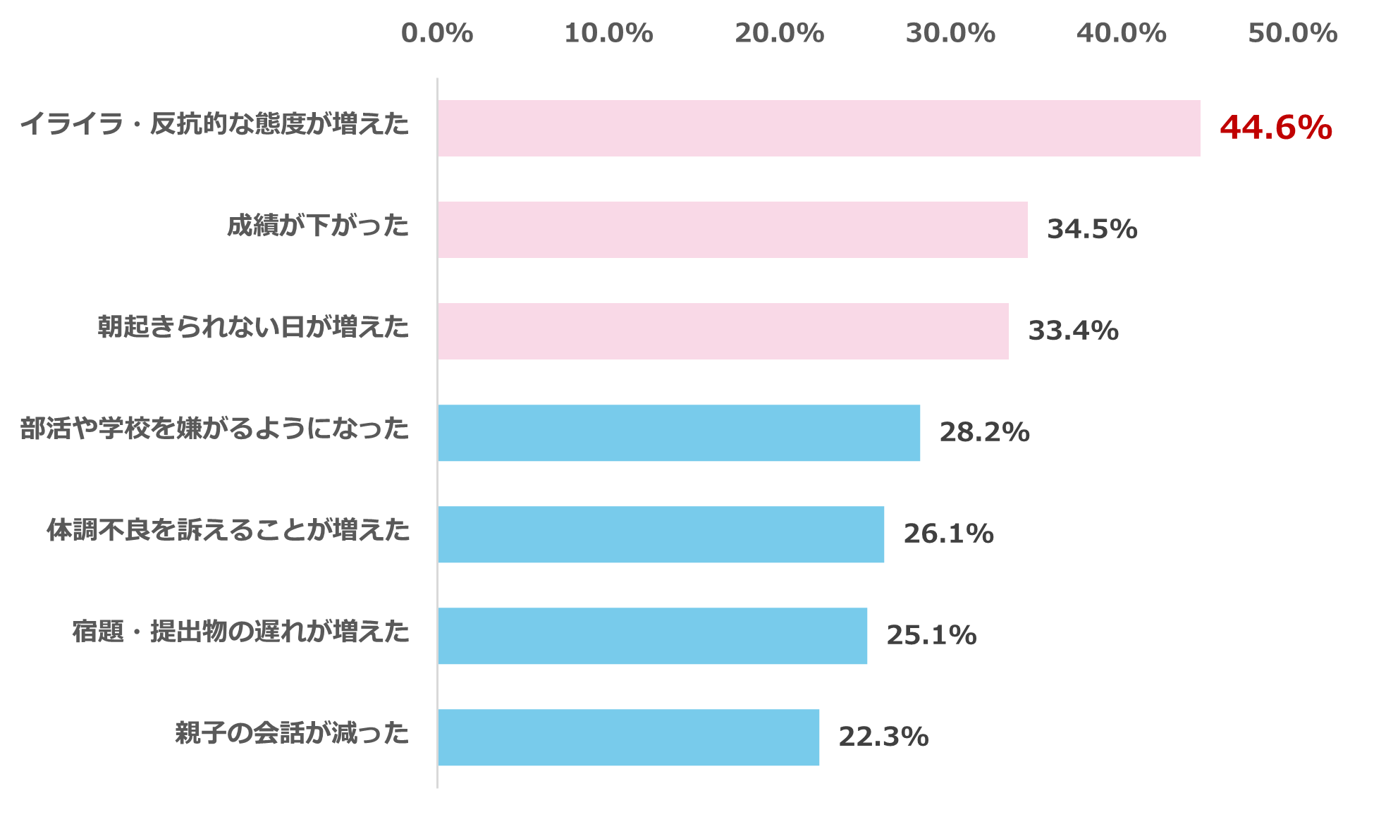精神面の変化に加え、学習面や生活リズムにも影響がみられるケースがあることがうかがえます。思春期の変化と中学進学による環境の変化が重なる時期であることも背景にあると考えられます。