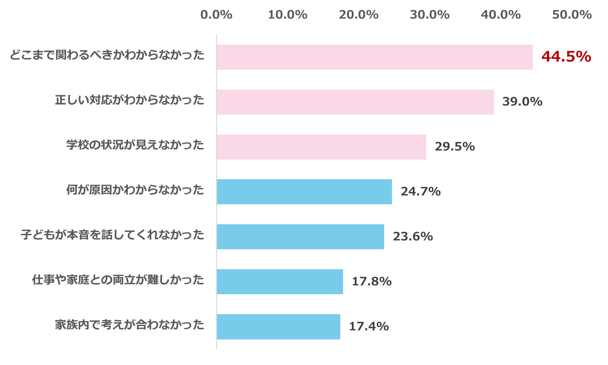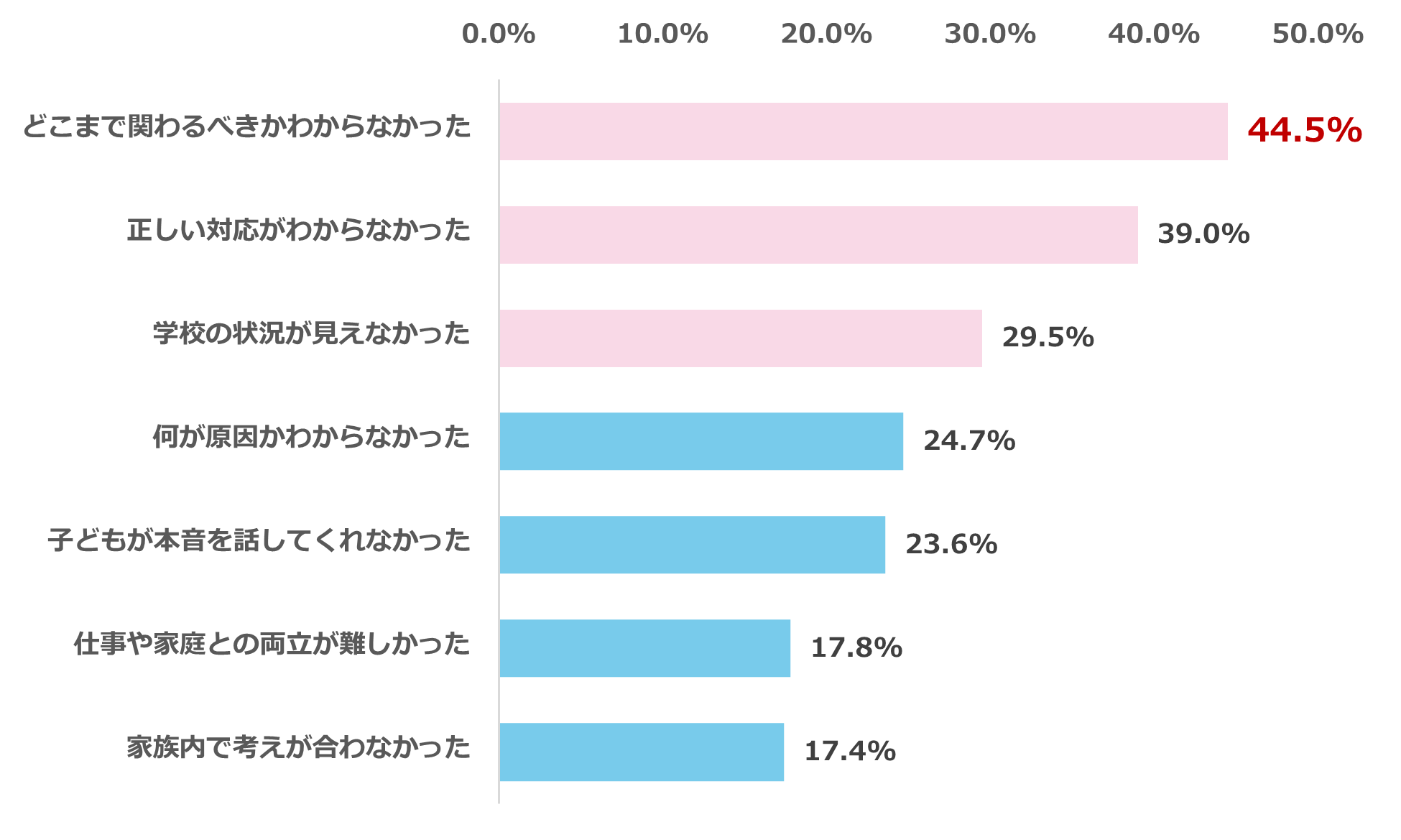 「中1の壁」を経験したと回答した保護者に、対応する中で特に難しいと感じたことを尋ねたところ、最多回答は「どこまで関わるべきかわからなかった(44.5%)」、次いで「正しい対応がわからなかった(39.0%)」、「学校の状況が見えなかった(29.5%)」と続きました。