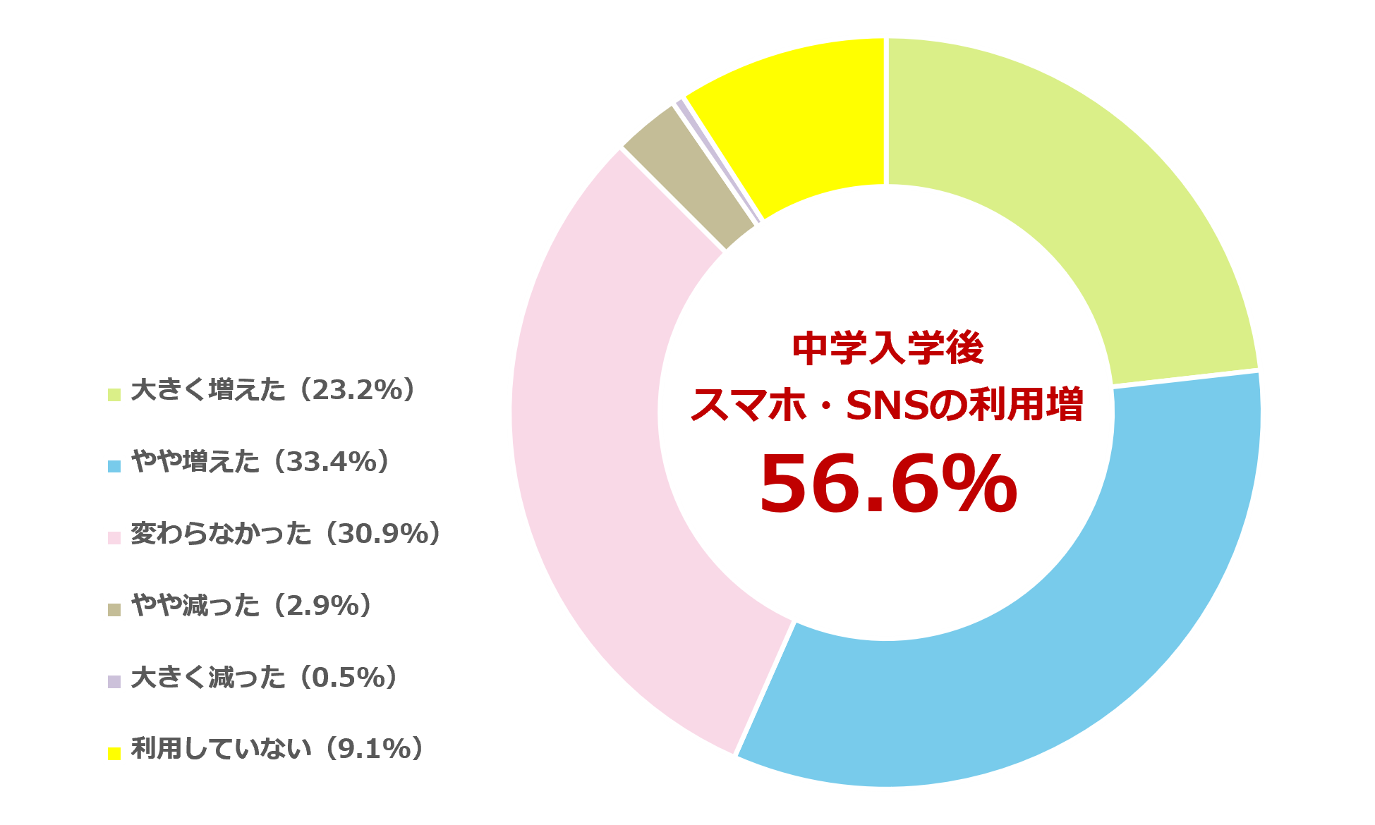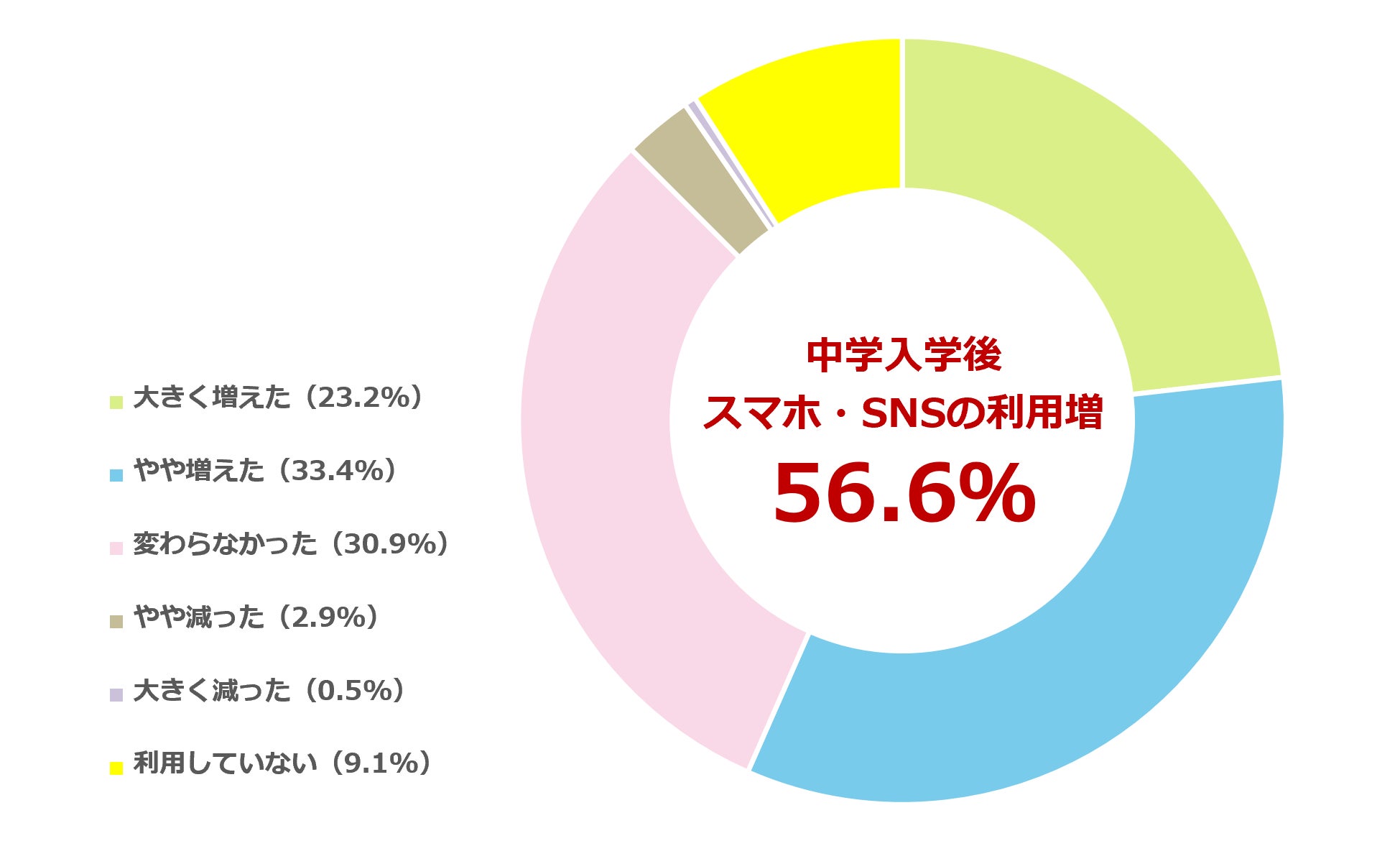 中学入学後(1学期中)に、子どものSNSやスマートフォンの利用に変化があったかを尋ねたところ、56.6%が「増えた」(大きく増えた:23.2%、やや増えた:33.4%)と回答しました。中学進学を機に、デジタル利用環境に変化がみられる様子がうかがえます。