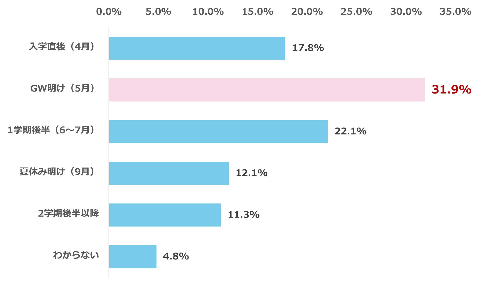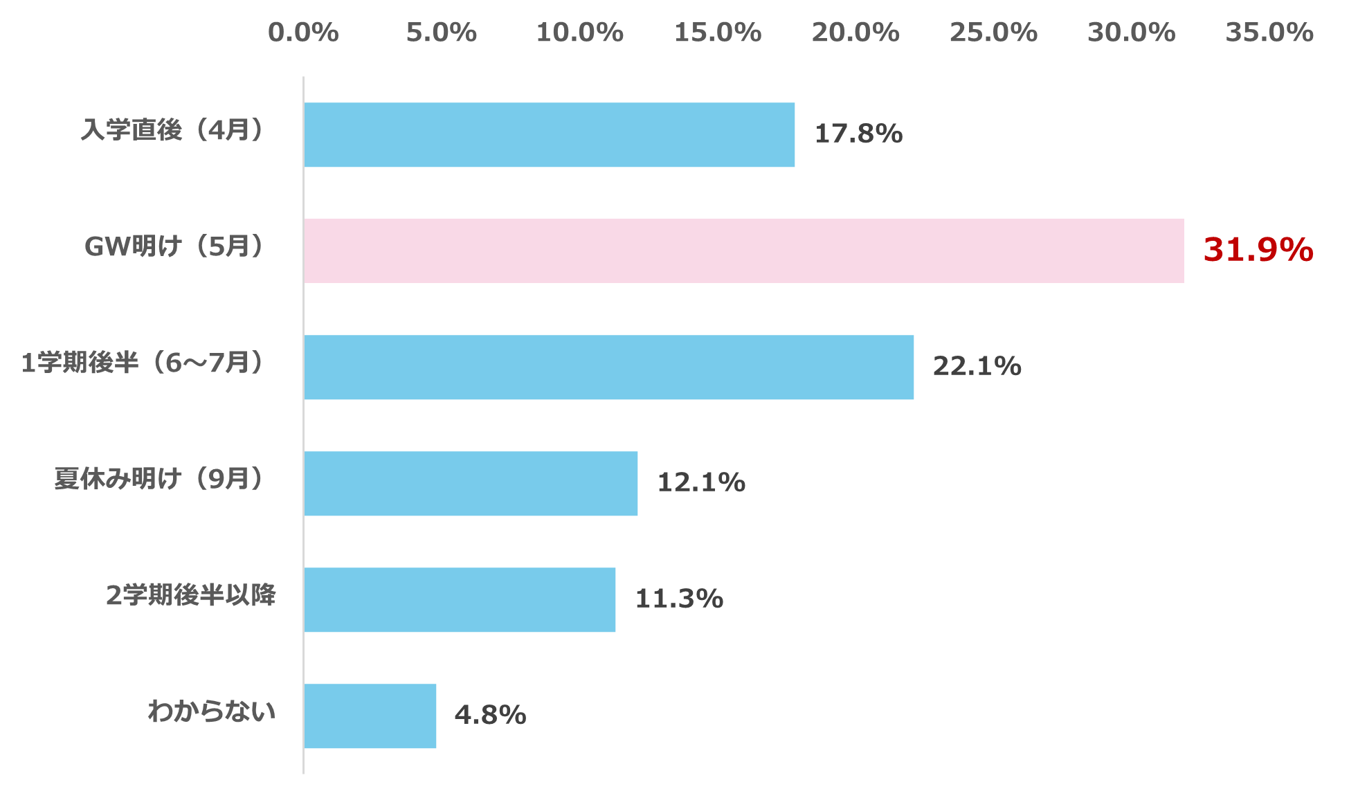 入学直後の緊張が落ち着く頃に、学習の本格化や生活リズムの変化が重なることもあり、5月以降に負担を感じるケースが一定数あることがうかがえます。入学直後だけでなく、その後の時期も含めて様子を見守ることが大切と考えられます。