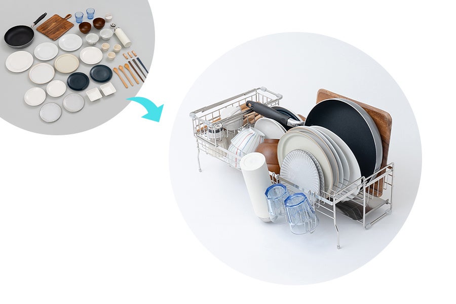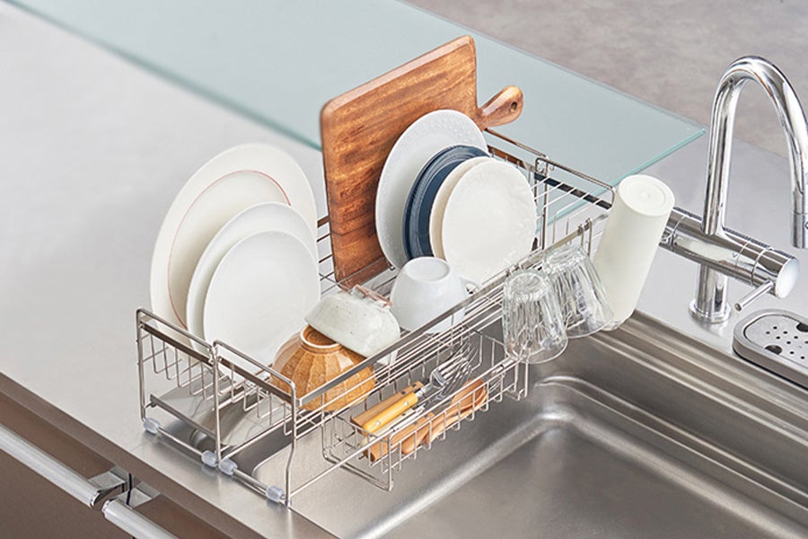 家族4人分の食器と調理器具も収納できる、大容量の水切りディッシュラック。洗い物が少ない時は縮めて超スリムになり、シンクを広々使えます。カトラリーやグラスを置ける専用の付属品付き。