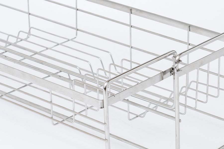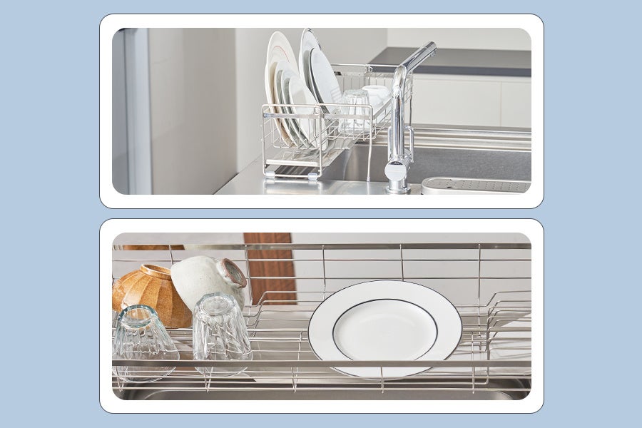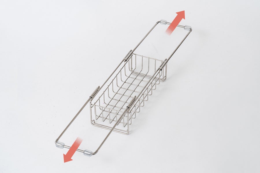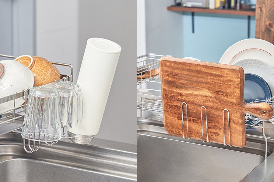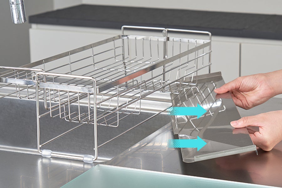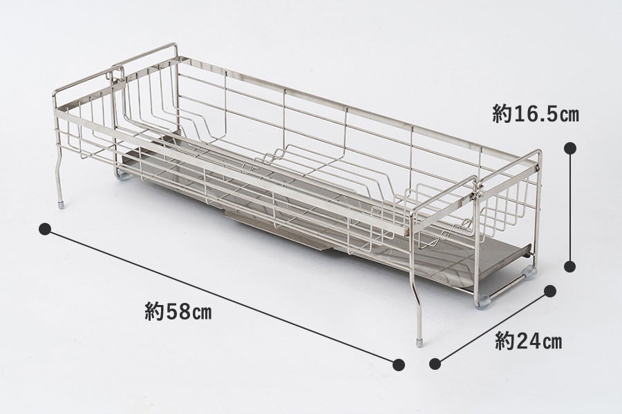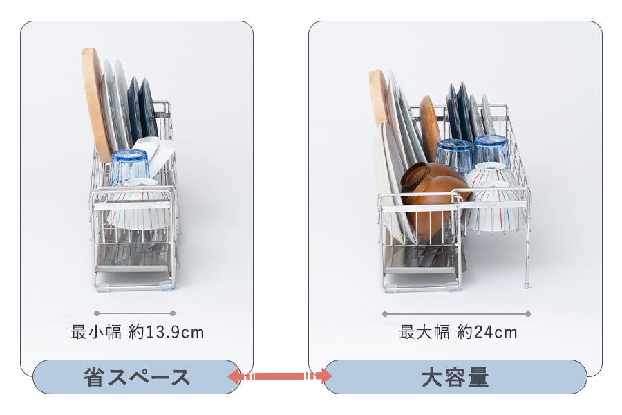 かごのサイズが伸縮式でスリムにも大容量にもなる、便利な水切りディッシュラックが登場。