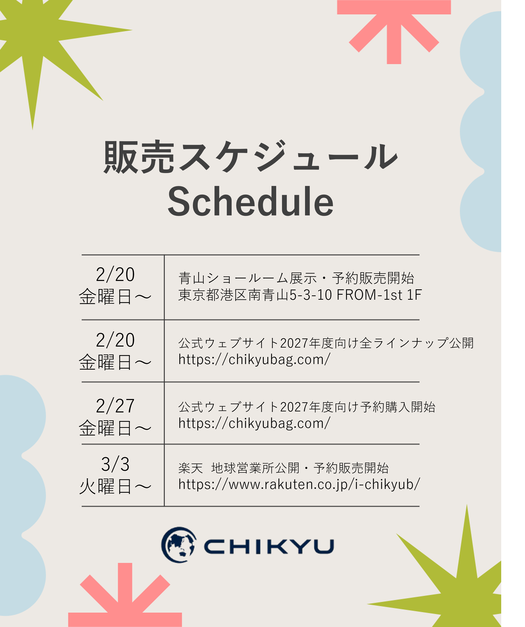 ランドセルの企画・販売を行うCHIKYU株式会社(東京都港区、代表取締役:辻谷安央)は、2月より順次2027年春ご入学のお子さま向け最新ランドセルを公開・予約販売を開始いたします。