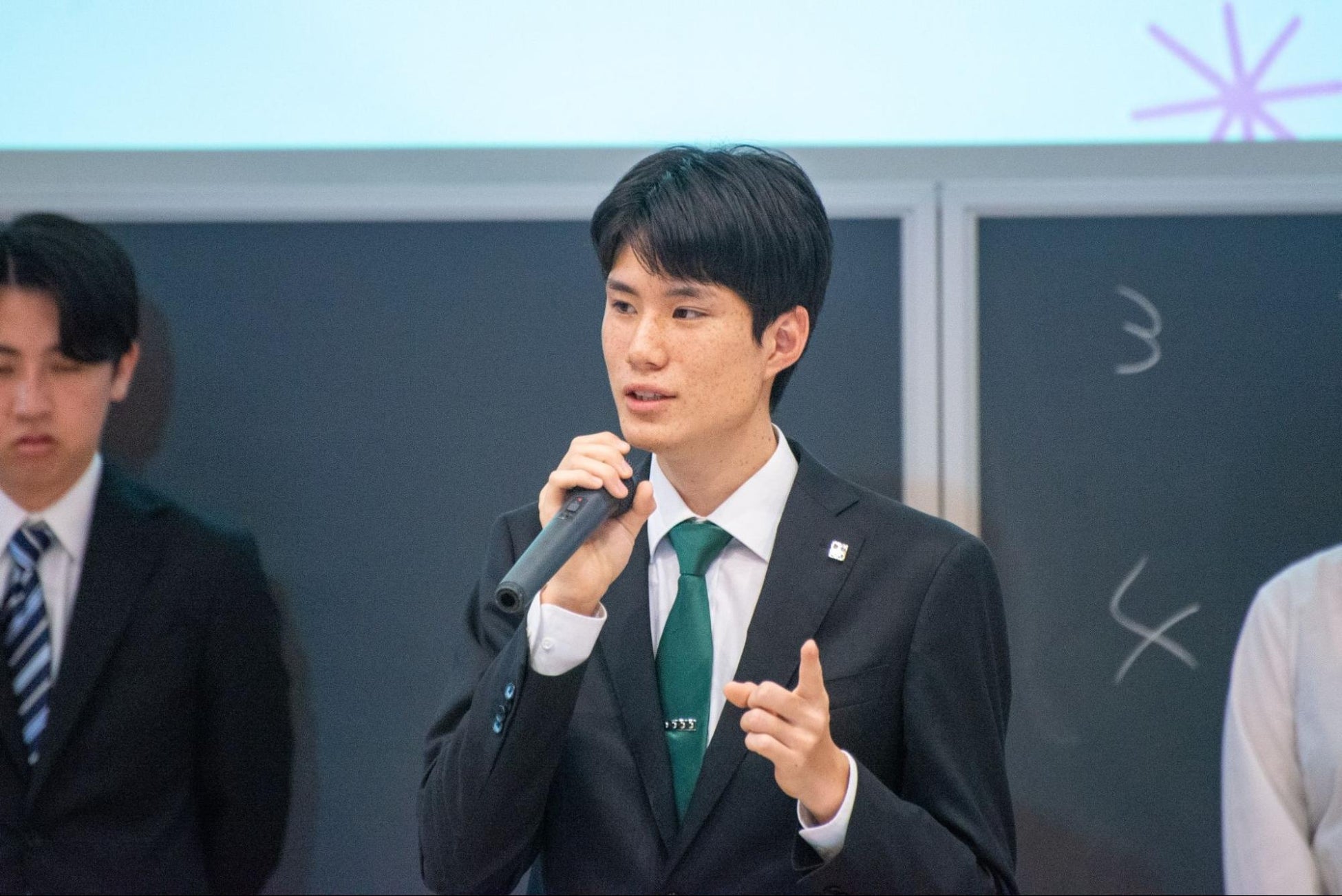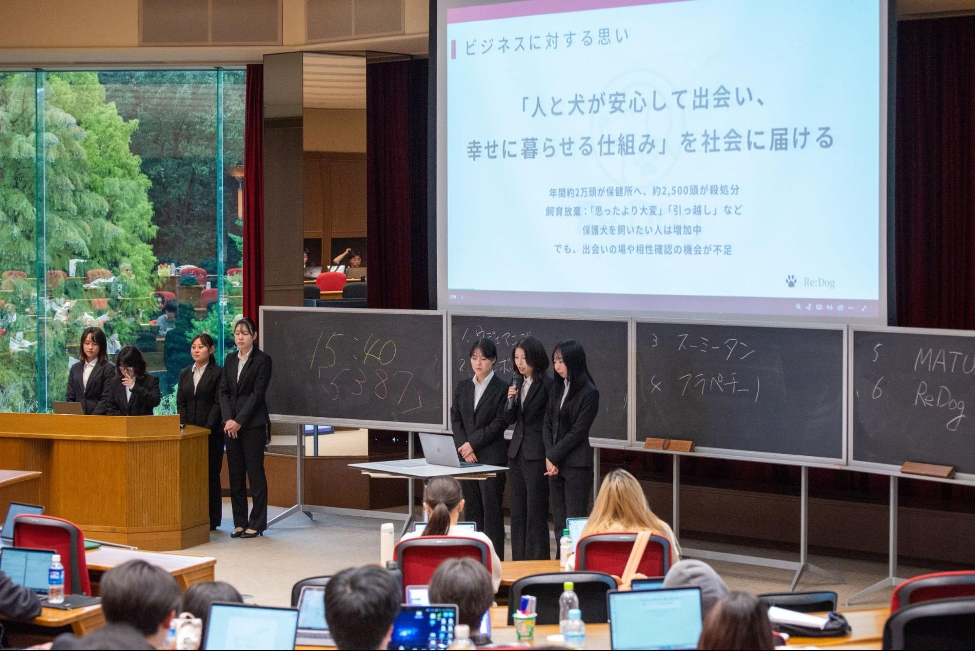 商学部3年生を対象に、自らビジネスプランを構想する授業「事業構想実践」が開講されました。この科目はインテンシブ教育プログラム(集中プログラム)の一つで、新規事業の創出に関わるケースを通して、起業家がどのように事業を実現し、関係者を巻き込みながらチームをつくり上げたのかを学びます。今回は「食品加工会社(X社)」を題材にディスカッションを行い、X社が抱える課題に対する新たな事業展開を検討しました。授業の最終日には、これまでの学びを生かしてチームごとにビジネスプランを発表するプチビジネスプランコンテストを実施しました。