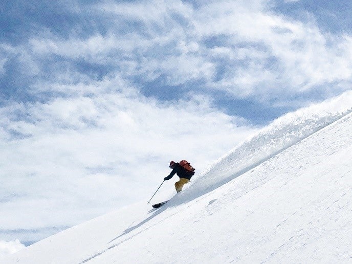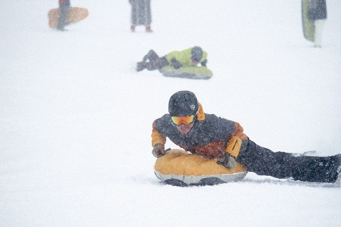 スイス発祥のアクティビティ「エアボード」。空気でふくらんだ専用のボードにうつ伏せの姿勢で乗り、ゲレンデを滑走します。雪面に近い視線のため、スピード感はスキーやスノーボード以上。ボードにはエッジもあるので、右に左にと自在に操作できます。