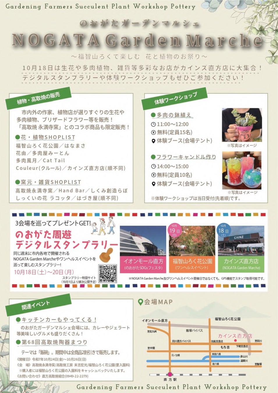 本イベントは、カインズ直方店の協力により同店の駐車場を会場とします。市内外から植物や花に関連する雑貨を取り扱う店舗が多数出店します。
