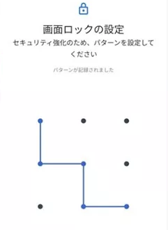 Android のパターンロックとは画面に表示される9つの点から4つ以上の点を一筆書きで結んでロックを解除する方法です。パターンを複雑にするほどセキュリティは高まりますが、パターンを忘れてしまう危険性も高まります。