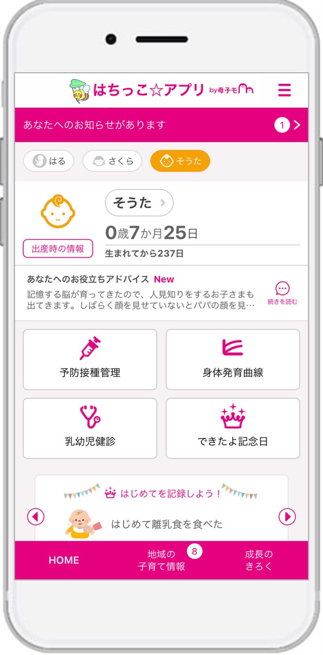 茨城県五霞町に採用された『はちっこ☆アプリ』は、スマートフォン・タブレット端末・PCに対応したサービスで、妊産婦と子どもの健康データの記録・管理や予防接種のスケジュール管理、出産・育児に関するアドバイスの提供、離れた地域に住む祖父母など家族との共有機能や、町が配信する地域の情報をお知らせするなど、育児や仕事に忙しい母親や父親を助けてくれる便利な機能が充実しています。