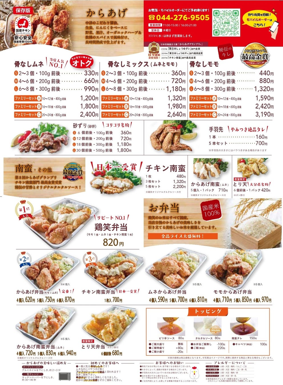 この度リニューアルオープンいたします「鶏笑 川崎大師店」は、京浜急行電鉄 川崎大師駅から徒歩約12分(川崎市営バス 藤崎一丁目バス停から徒歩1 分)のところにあります。鶏笑川崎大師店のLINE公式アカウントまたは店舗へのお電話で事前にご注文いただければ、店頭でお待たせすることなく商品をお渡しできます。昼食のお弁当、晩御飯のおかずやお酒のおつまみなど、毎日のお食事の中で、最高金賞受賞のからあげのおいしさをご堪能下さい。