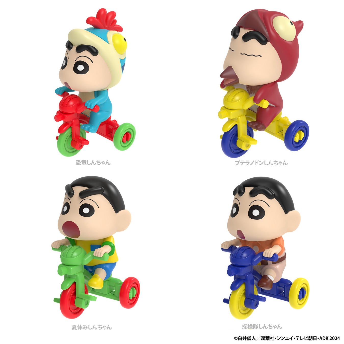 映画に登場する恐竜のコスチュームを着た「プテラノドンしんちゃん」をはじめ、「恐竜しんちゃん」「夏休みしんちゃん」「探検隊しんちゃん」の全4種。