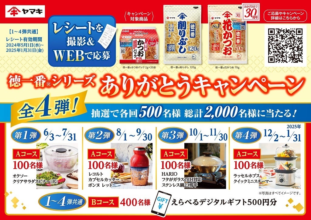 本キャンペーンは、2025年1月31日までの期間で全4回にわたって実施し、「徳一番®花かつお70g」を含む『徳一番®』シリーズをご購入いただいた方の中から抽選で総計2,000名様に、サラダスピナーやミニスチーマーなどの人気キッチン用品やデジタルギフトをプレゼントします。第1弾は2024年6月3日11:00より開始します。