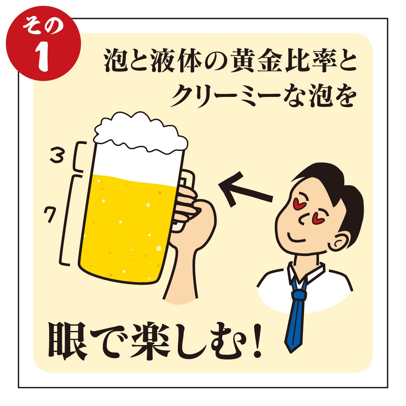 お手元に生ビールが届きましたら、泡と液体の黄金比率とクリーミーな泡を愛でましょう。あまりじっくり鑑賞すると泡が消えてしまいますのでほどほどでお願いいたします。