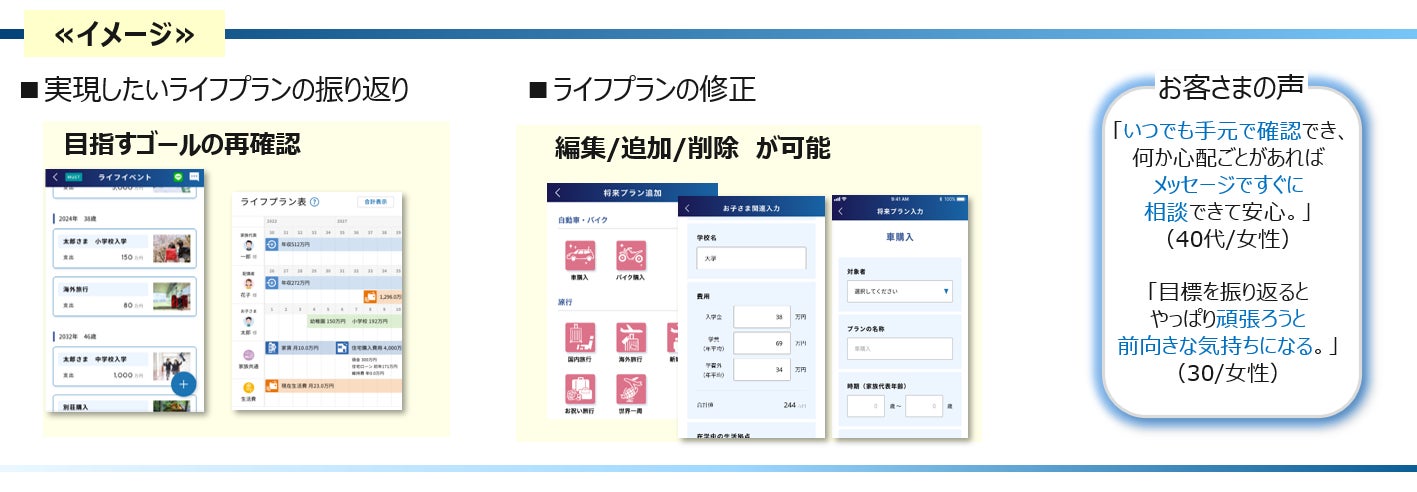 この度、お客さまのライフプラン実現というゴールに向けてのフォローを強化すべく、当社アプリ内のライフプラン機能を拡充し、ライフプランナーと創ったオーダーメイドのライフプランを、いつでも最新の状況で確認することができるようになりました。また、近況や今後予定するライフプランに変更があった場合、その内容を当社アプリに入力することで、即座に将来にわたるライフプランの変化をご確認いただくことが可能となります。