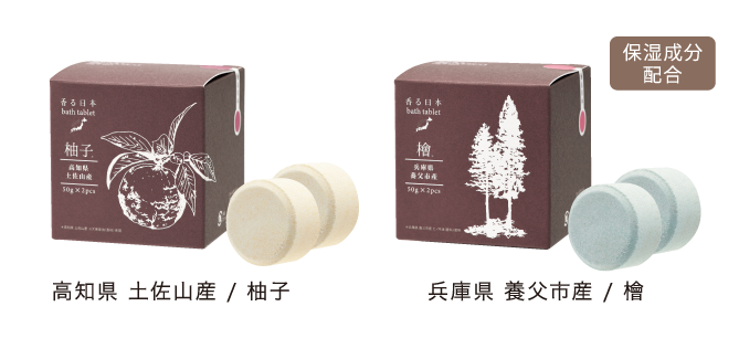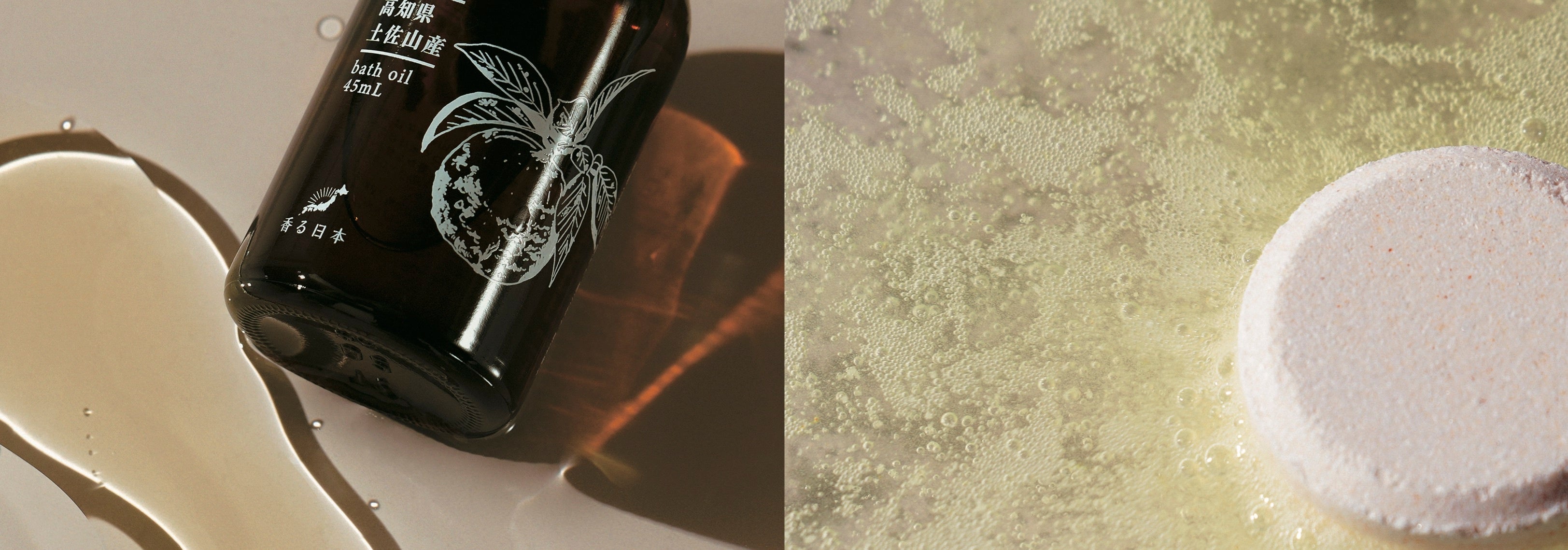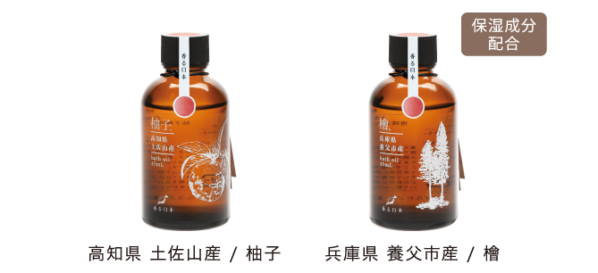 そんな日本に根付いた入浴習慣を香りと共にさらに楽しんでいただきたいと思い、ブランド初のバスアイテムを開発。柚子湯や檜風呂をイメージし、日本のお風呂文化とも馴染みが深く、特に香り立ちが良い「高知県土佐山産 柚子」「兵庫県養父(やぶ)市産 檜」の2種の香りを採用しています。