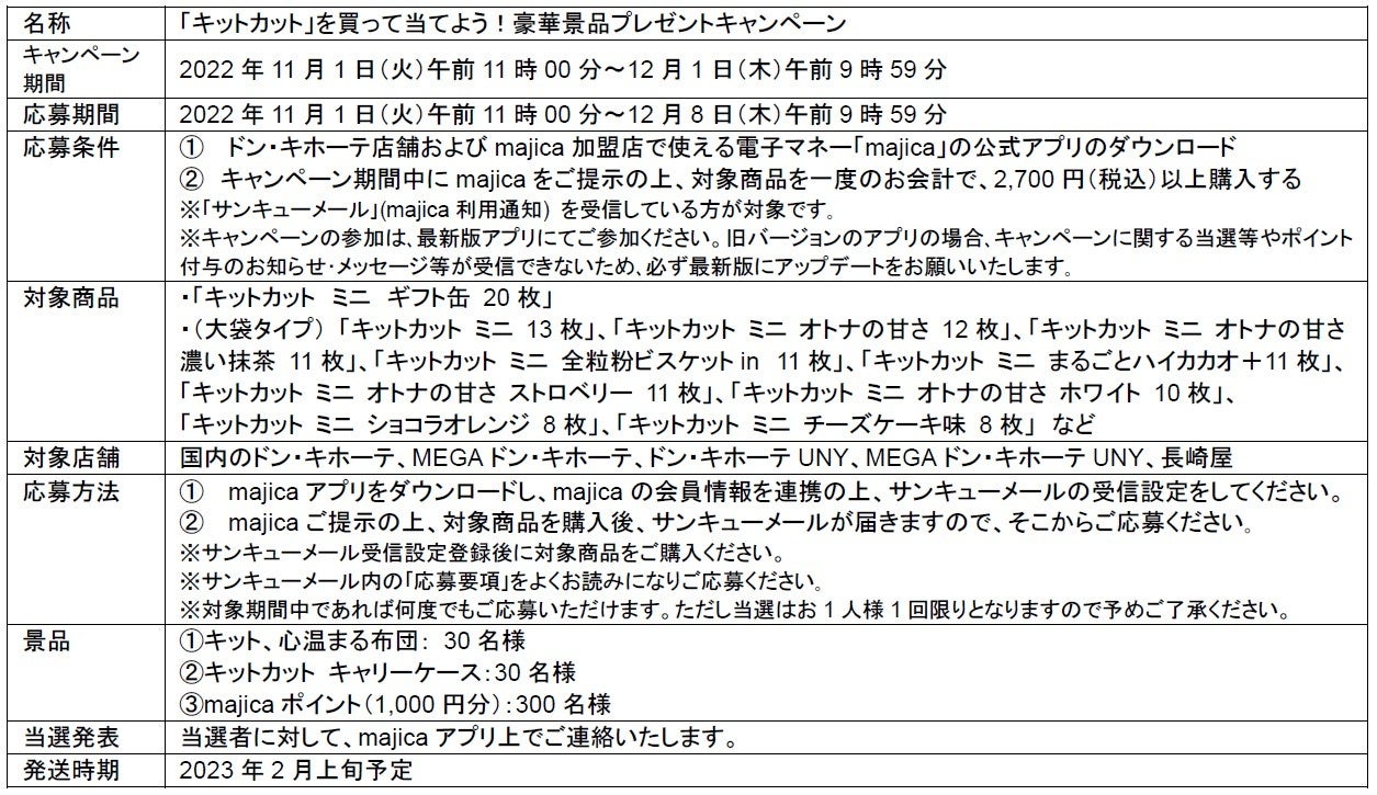 「キットカット ミニ ギフト缶」の新発売に合わせて、全国の「ドン・キホーテ」店舗で対象商品を購入すると、豪華景品を抽選でプレゼントするキャンペーンを実施します。