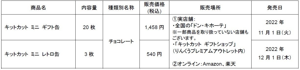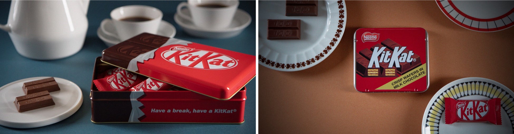もう1つの「キットカット ミニ レトロ缶」は、「キットカット」が1973年に日本に初上陸した時のデザインをモチーフにした、キュートなレトロデザインとなっており、12月1日(木)より発売します。幅11cm程の小型缶のため、ご自身の小物アイテムをカバンの中に入れて持ち運ぶための“バッグインバッグ”としても使うことができます。