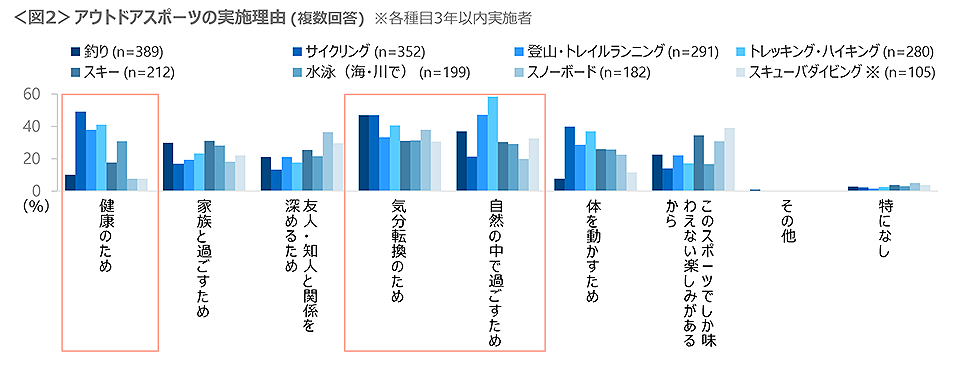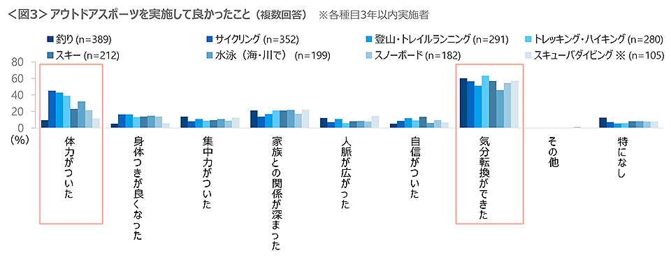 3年以内に実施したアウトドアスポーツの種別ごとに実施理由や実施して良かったことを聴取した。実施理由は「自然の中で過ごす」「気分転換」「健康」が全般的に高い。特に「自然の中で過ごす」は、トレッキング・ハイキング、登山・トレイルランニング、釣りの実施者、「健康」はサイクリング実施者で高い傾向にある。実施して良かったことは、全種別で「気分転換ができた」が最も高く、次いで釣りを除く種類で「体力がついた」であった。<図2、3>
