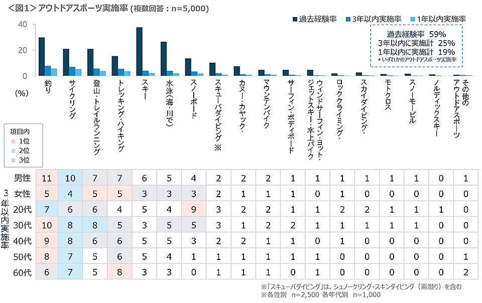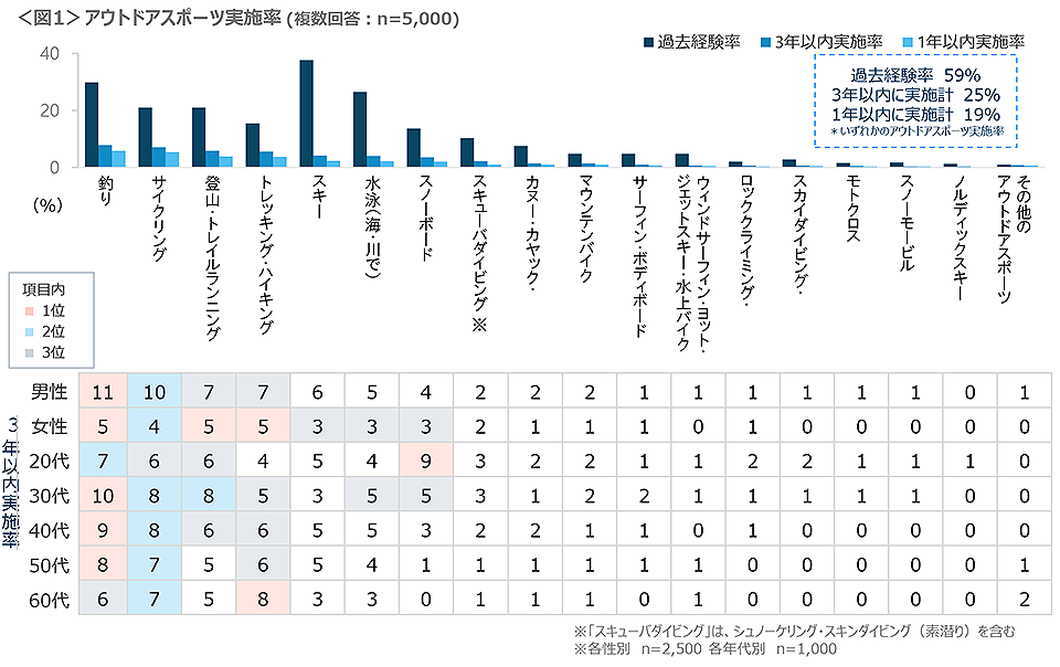 アウトドアスポーツの実施経験者は59%、直近3年以内は25%、1年以内は19%である。直近3年以内の実施率のTOP5は、「釣り」「サイクリング」「登山・トレイルランニング」「トレッキング・ハイキング」「スキー」。温暖化の影響もありウインタースポーツ人口の減少はかねてよりみられていたが、「スキー」の経験者は38%から、直近1年以内の実施が2%と減少が顕著であった。いずれもアウトドアスポーツ実施率は男性で高い。年代別のアウトドアスポーツ直近3年以内実施率のTOPは、20代で「スノーボード」、30~50代は「釣り」、60代は「トレッキング・ハイキング」。<図1>