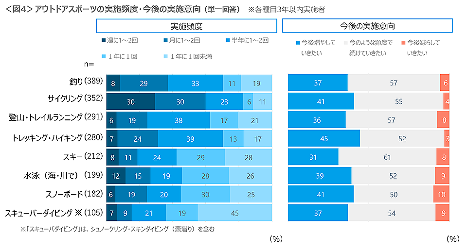 実施頻度が最も多いのは「サイクリング」であり、”月に1回以上の実施者”は6割を占める。次いで多いのは「釣り」「トレッキング・ハイキング」。”今後増やしていきたい”アウトドアスポーツは、「トレッキング・ハイキング」「サイクリング」「スノーボード」において4割を超える。<図4>