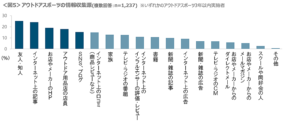 情報収集源は、「友人・知人」「インターネット上の記事」「お店やメーカーのHP」「アウトドア用品店の店員」「SNS、ブログ」「インターネット上の口コミ」が上位である。<図5>