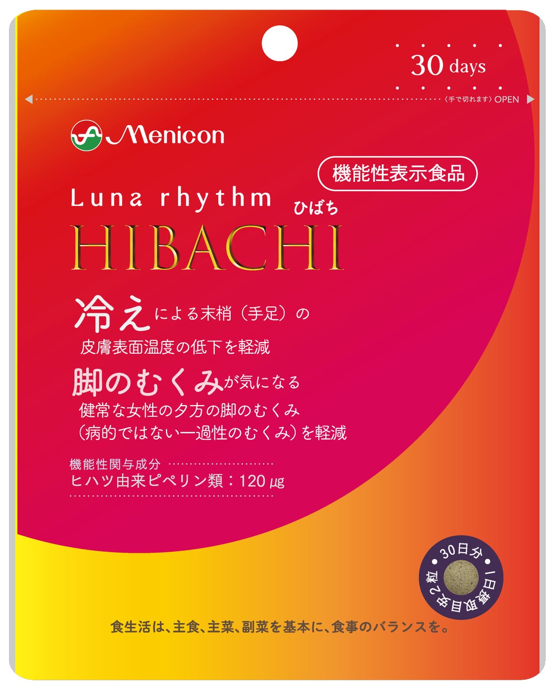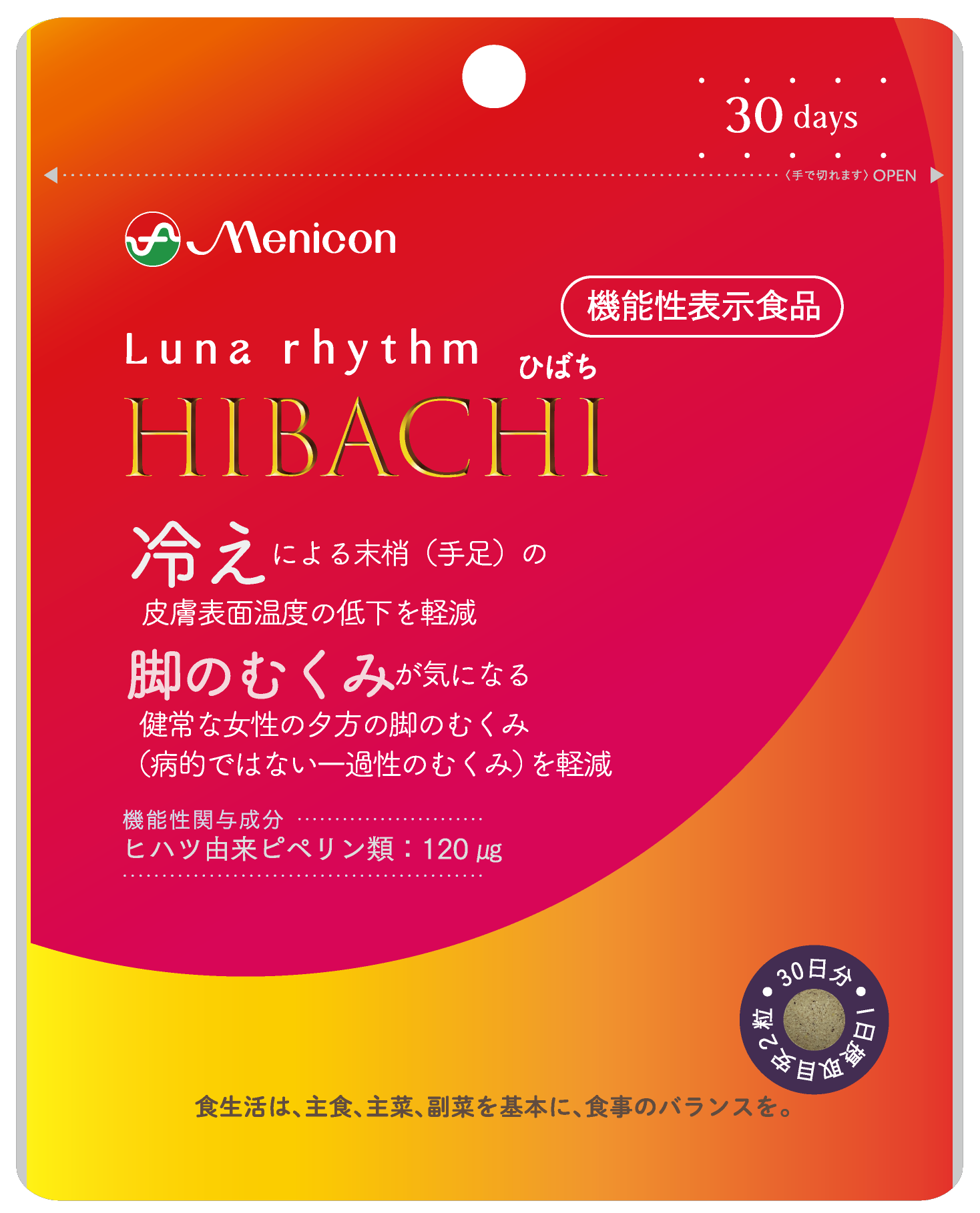 「ルナリズムHIBACHI(ひばち)」は、「ヒハツ由来ピペリン類」を機能性関与成分として「冷えにより低下した血流(末梢血流)を正常に整え、冷えによる末梢(手足)の皮膚表面温度の低下を軽減する」機能とともに「脚のむくみが気になる健常な女性の夕方の脚のむくみ(病的ではない一過性のむくみ)を軽減する」機能を併せ持った機能性表示食品です。