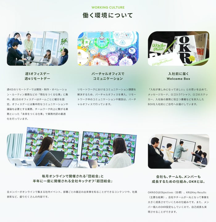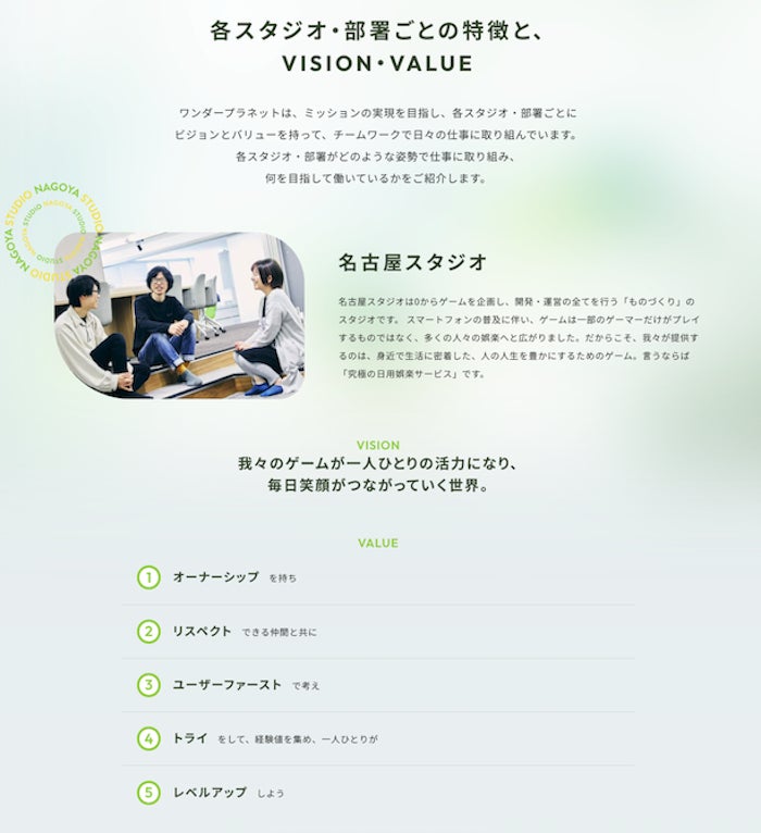 オンライン上の応募者とのコミュニケーションの中でもチームの雰囲気や業務内容、一緒に働くことが現実的に想像しやすくなるように、ゲーム運営の仕事のリアルを知ることができる「プロジェクトストーリー」というチーム単位での社員インタビューや、各職種の社員インタビューを公開しました。また、社風や職場の雰囲気が視覚的にイメージできる「働く環境について」といった新しいコンテンツの充実や各部署が掲げているビジョン・バリューも掲載しています。