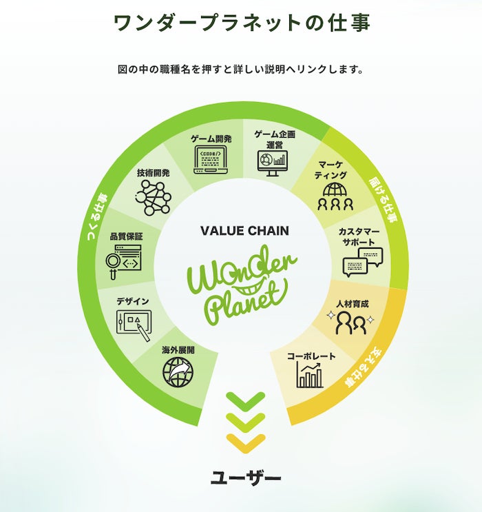 応募者が企業理解を深め可能性を感じてもらうために、世界規模で拡大を続けるモバイル向けゲーム市場の市場規模、ミッション「楽しいね!を、世界中の日常へ。」の実現を目指す当社の仕事を図解したバリューチェーンやビジネスモデルを紹介するコンテンツも充実させています。