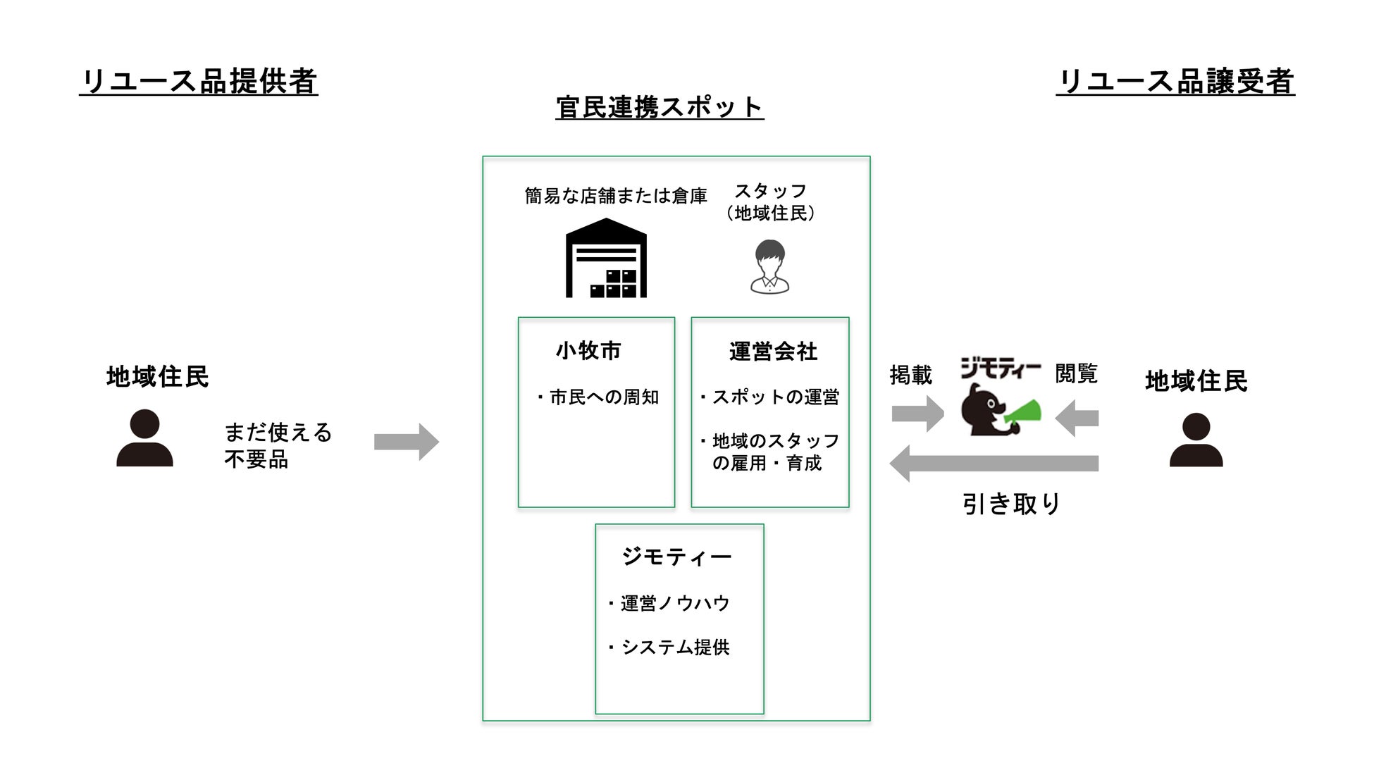ジモティースポットは、「不要になったけれどもまだ使えるモノ」を地域のコミュニティ内で有償または無償で譲り合うことが出来るサービスです。持ち込み希望の方は、ジモティースポットに持ち込むだけで、手軽に必要とする人に譲渡することができます。そして、譲り受け希望の方は、持ち込まれたモノの情報をジモティーで検索し、ジモティースポットで引き取ることでマッチングが成立する仕組みとなっています。