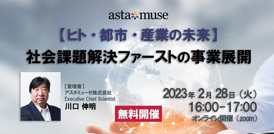 アスタミューゼ株式会社(本社:東京都千代田区、代表取締役社長 永井歩)は、2023年2月28日(火)16:00~17:00に、『2060 未来創造の白地図』著者、弊社のExecutive Chief Scientistである川口伸明による無料ウェビナー「【ヒト・都市・産業の未来】社会課題解決ファーストの事業展開」を開催いたします。