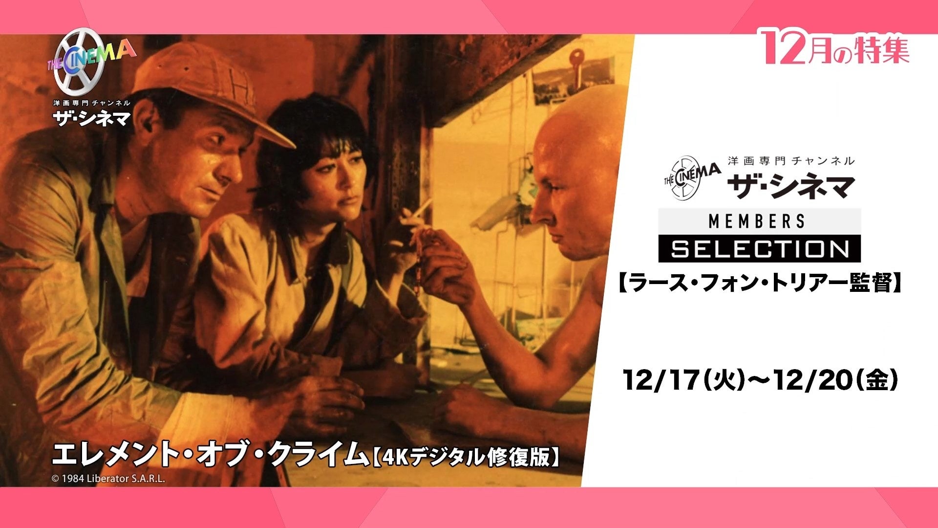 洋画専門チャンネルザ・シネマ(AXN株式会社、本社:東京都渋谷区、代表取締役社長 大園天樹)では、【ザ・シネマメンバーズ セレクション】として、カンヌ国際映画祭での受賞歴も持つ、世界が認める映像革新者ラース・フォン・トリアー監督作品の中から代表作である“ヨーロッパ三部作”と『奇跡の海』の4作品を12月17日(火)~20日(金)に4Kデジタル修復版でテレビ初放送いたします。