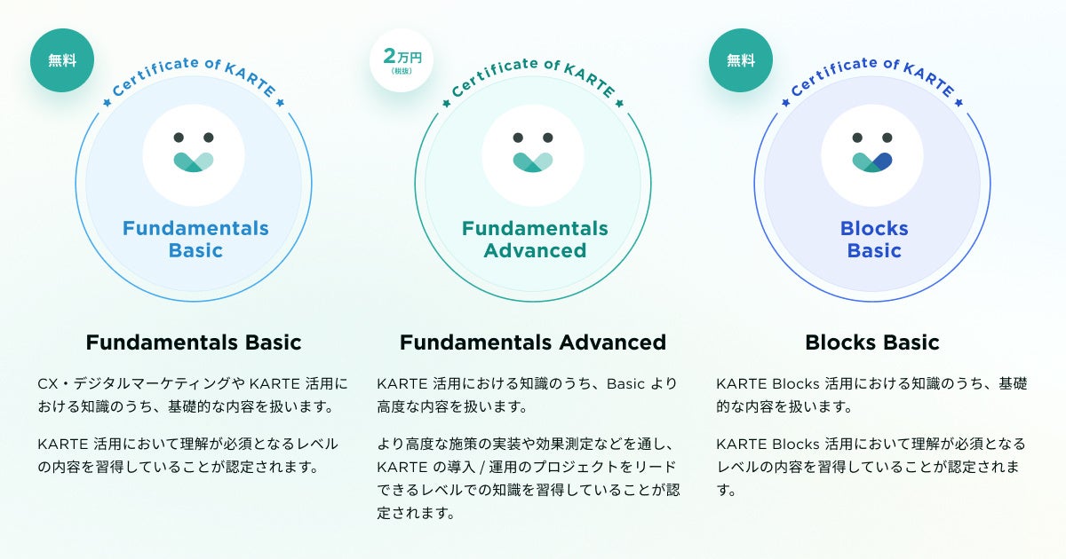2024年7月2日現在、「Certificate of KARTE」では3つの資格を用意しています。今後も、データ統合を実現するKARTE Datahubなど、KARTEシリーズのプロダクトごとやスキルごとに対応する資格を拡充し、KARTEを活用するデジタルマーケターやエンジニアの方々の知識とスキルを証明する資格として展開していきます。