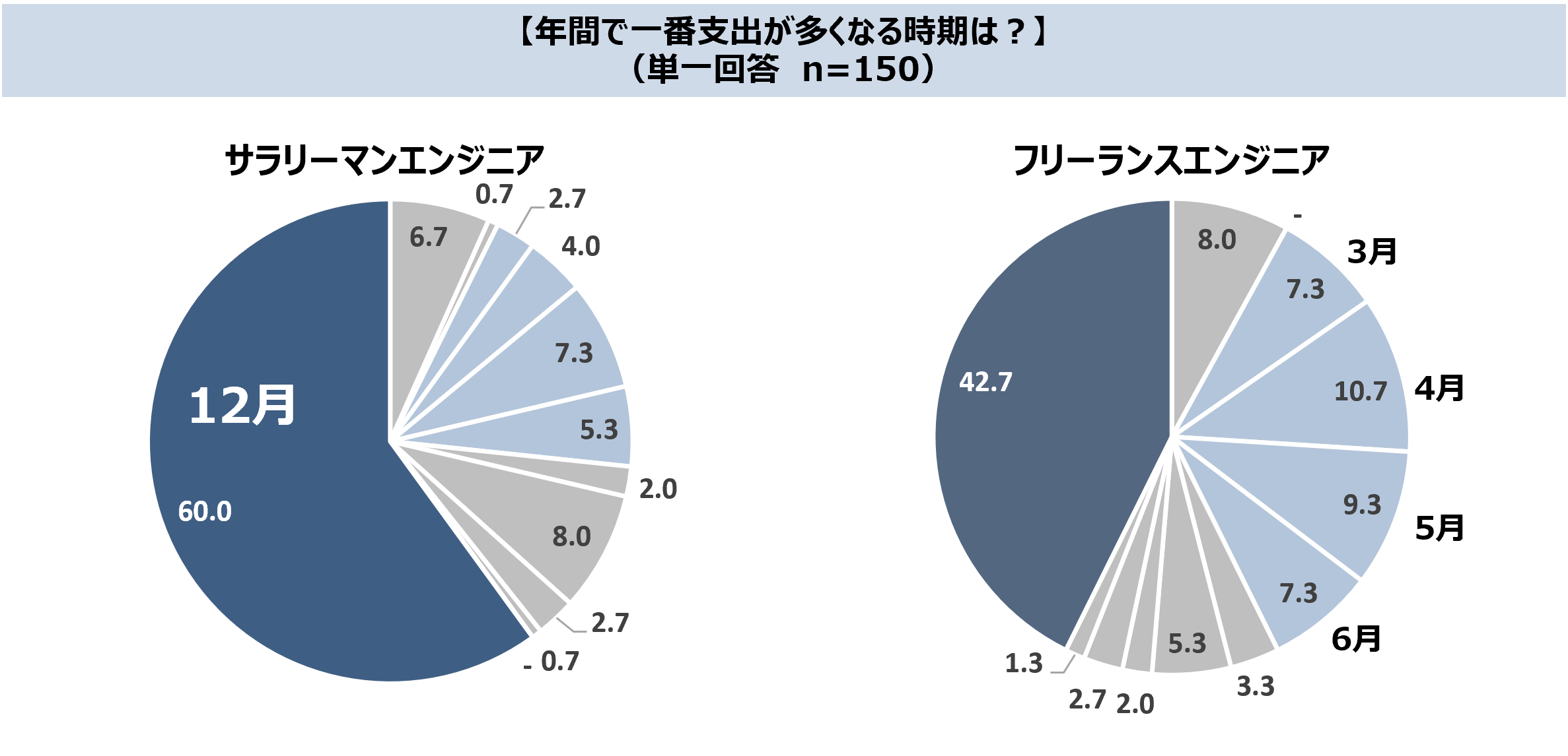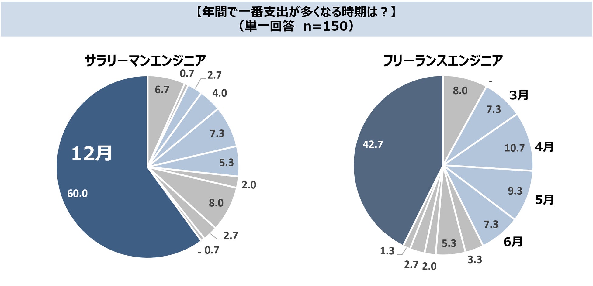 一方、サラリーマンエンジニアと比較してフリーランスエンジニアは“税金”の支払いにより3~5月の支出も多い傾向に。