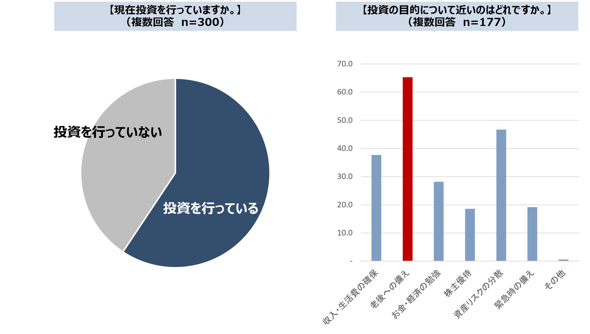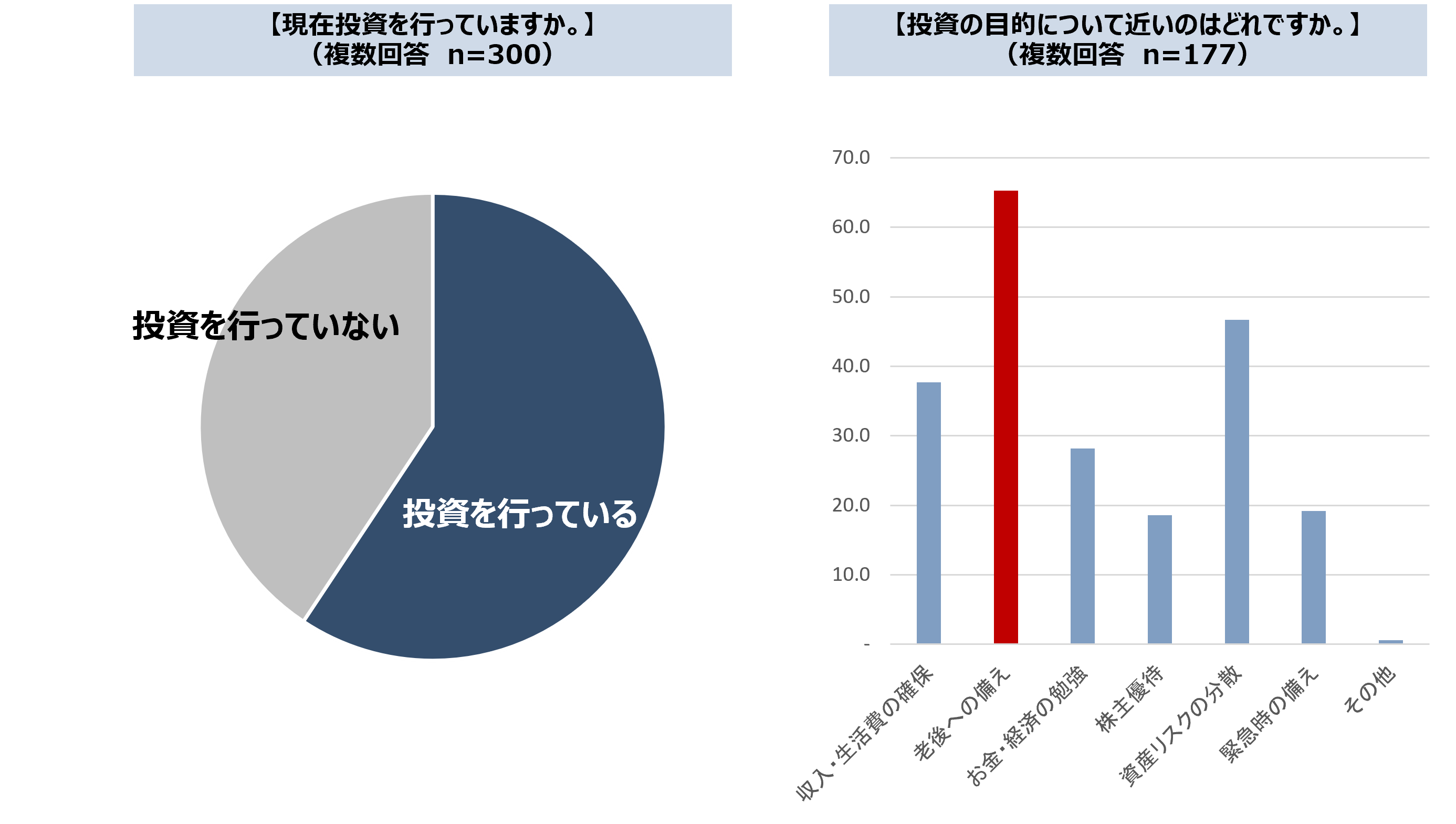 5人に3人のエンジニア(59.3%) が投資をしている事が分かりました。またどのような投資を行っているのか質問をしたところ、『新NISA』が55.9%、『株式』が52.0%、『投資信託』が49.2%と特に多い結果になりました。また投資の目的として「老後への備え」と回答した人が最多(65.3%)の結果となりました。