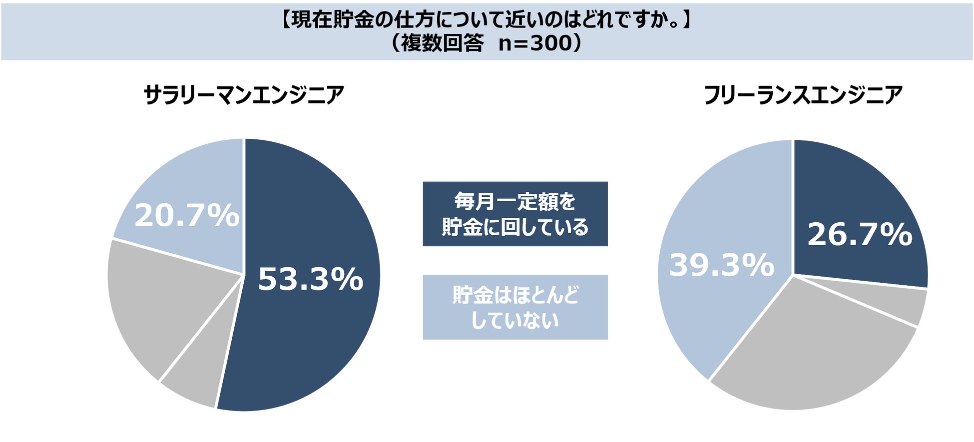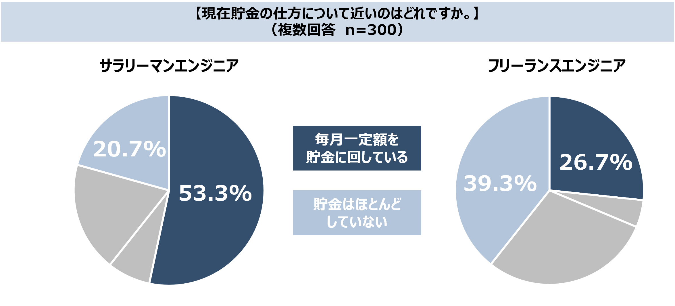 貯金の仕方について質問したところ、【毎月一定額を貯金に回している】と回答したサラリーマンエンジニアは53.3%、フリーランスエンジニアは約半数の26.7%となりました。またほとんど貯金していないと回答したフリーランスエンジニアの割合は39.3%となっており、サラリーマンエンジニアの回答20.7%の約2倍となりました。